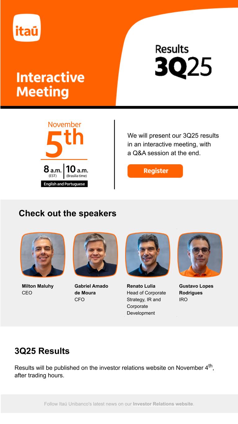 We will present our 3Q25 results in an interactive meeting, with a Q&A session at the end. Check out the speakers Milton Maluhy CEO Gabriel Amado de Moura CFO Renato Lulia Head of Corporate Strategy, IR and Corporate Development Gustavo Lopes Rodrigues IRO 3Q25 Results Results will be published on the investor relations website on November 4th, after trading hours. Follow Itaú Unibanco's latest news on our Investor Relations website.