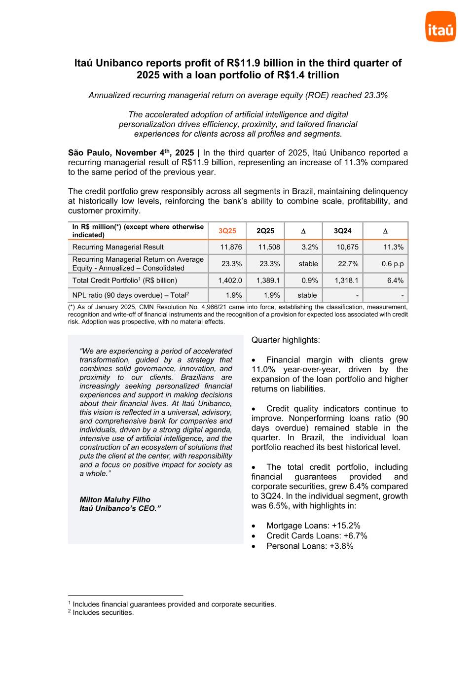Itaú Unibanco reports profit of R$11.9 billion in the third quarter of 2025 with a loan portfolio of R$1.4 trillion Annualized recurring managerial return on average equity (ROE) reached 23.3% The accelerated adoption of artificial intelligence and digital personalization drives efficiency, proximity, and tailored financial experiences for clients across all profiles and segments. São Paulo, November 4th, 2025 | In the third quarter of 2025, Itaú Unibanco reported a recurring managerial result of R$11.9 billion, representing an increase of 11.3% compared to the same period of the previous year. The credit portfolio grew responsibly across all segments in Brazil, maintaining delinquency at historically low levels, reinforcing the bank’s ability to combine scale, profitability, and customer proximity. (*) As of January 2025, CMN Resolution No. 4,966/21 came into force, establishing the classification, measurement, recognition and write-off of financial instruments and the recognition of a provision for expected loss associated with credit risk. Adoption was prospective, with no material effects. Quarter highlights: • Financial margin with clients grew 11.0% year-over-year, driven by the expansion of the loan portfolio and higher returns on liabilities. • Credit quality indicators continue to improve. Nonperforming loans ratio (90 days overdue) remained stable in the quarter. In Brazil, the individual loan portfolio reached its best historical level. • The total credit portfolio, including financial guarantees provided and corporate securities, grew 6.4% compared to 3Q24. In the individual segment, growth was 6.5%, with highlights in: • Mortgage Loans: +15.2% • Credit Cards Loans: +6.7% • Personal Loans: +3.8% 1 Includes financial guarantees provided and corporate securities. 2 Includes securities. In R$ million(*) (except where otherwise indicated) 3Q25 2Q25  3Q24  Recurring Managerial Result 11,876 11,508 3.2% 10,675 11.3% Recurring Managerial Return on Average Equity - Annualized – Consolidated 23.3% 23.3% stable 22.7% 0.6 p.p Total Credit Portfolio1 (R$ billion) 1,402.0 1,389.1 0.9% 1,318.1 6.4% NPL ratio (90 days overdue) – Total2 1.9% 1.9% stable - - "We are experiencing a period of accelerated transformation, guided by a strategy that combines solid governance, innovation, and proximity to our clients. Brazilians are increasingly seeking personalized financial experiences and support in making decisions about their financial lives. At Itaú Unibanco, this vision is reflected in a universal, advisory, and comprehensive bank for companies and individuals, driven by a strong digital agenda, intensive use of artificial intelligence, and the construction of an ecosystem of solutions that puts the client at the center, with responsibility and a focus on positive impact for society as a whole.” Milton Maluhy Filho Itaú Unibanco’s CEO.”