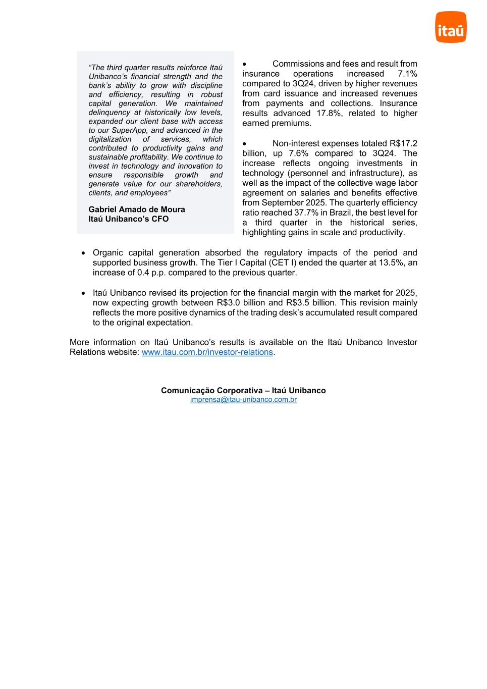 • Commissions and fees and result from insurance operations increased 7.1% compared to 3Q24, driven by higher revenues from card issuance and increased revenues from payments and collections. Insurance results advanced 17.8%, related to higher earned premiums. • Non-interest expenses totaled R$17.2 billion, up 7.6% compared to 3Q24. The increase reflects ongoing investments in technology (personnel and infrastructure), as well as the impact of the collective wage labor agreement on salaries and benefits effective from September 2025. The quarterly efficiency ratio reached 37.7% in Brazil, the best level for a third quarter in the historical series, highlighting gains in scale and productivity. • Organic capital generation absorbed the regulatory impacts of the period and supported business growth. The Tier I Capital (CET I) ended the quarter at 13.5%, an increase of 0.4 p.p. compared to the previous quarter. • Itaú Unibanco revised its projection for the financial margin with the market for 2025, now expecting growth between R$3.0 billion and R$3.5 billion. This revision mainly reflects the more positive dynamics of the trading desk’s accumulated result compared to the original expectation. More information on Itaú Unibanco’s results is available on the Itaú Unibanco Investor Relations website: www.itau.com.br/investor-relations. Comunicação Corporativa – Itaú Unibanco imprensa@itau-unibanco.com.br “The third quarter results reinforce Itaú Unibanco’s financial strength and the bank’s ability to grow with discipline and efficiency, resulting in robust capital generation. We maintained delinquency at historically low levels, expanded our client base with access to our SuperApp, and advanced in the digitalization of services, which contributed to productivity gains and sustainable profitability. We continue to invest in technology and innovation to ensure responsible growth and generate value for our shareholders, clients, and employees” Gabriel Amado de Moura Itaú Unibanco’s CFO