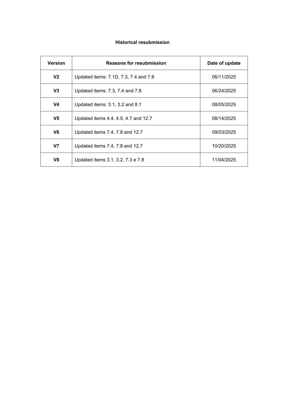 Historical resubmission Version Reasons for resubmission Date of update V2 Updated items: 7.1D, 7.3, 7.4 and 7.8 06/11/2025 V3 Updated items: 7.3, 7.4 and 7.8 06/24/2025 V4 Updated items: 3.1, 3.2 and 8.1 08/05/2025 V5 Updated items 4.4, 4.5, 4.7 and 12.7 08/14/2025 V6 Updated items 7.4, 7.8 and 12.7 09/03/2025 V7 Updated items 7.4, 7.8 and 12.7 10/20/2025 V8 Updated items 3.1, 3.2, 7.3 e 7.8 11/04/2025