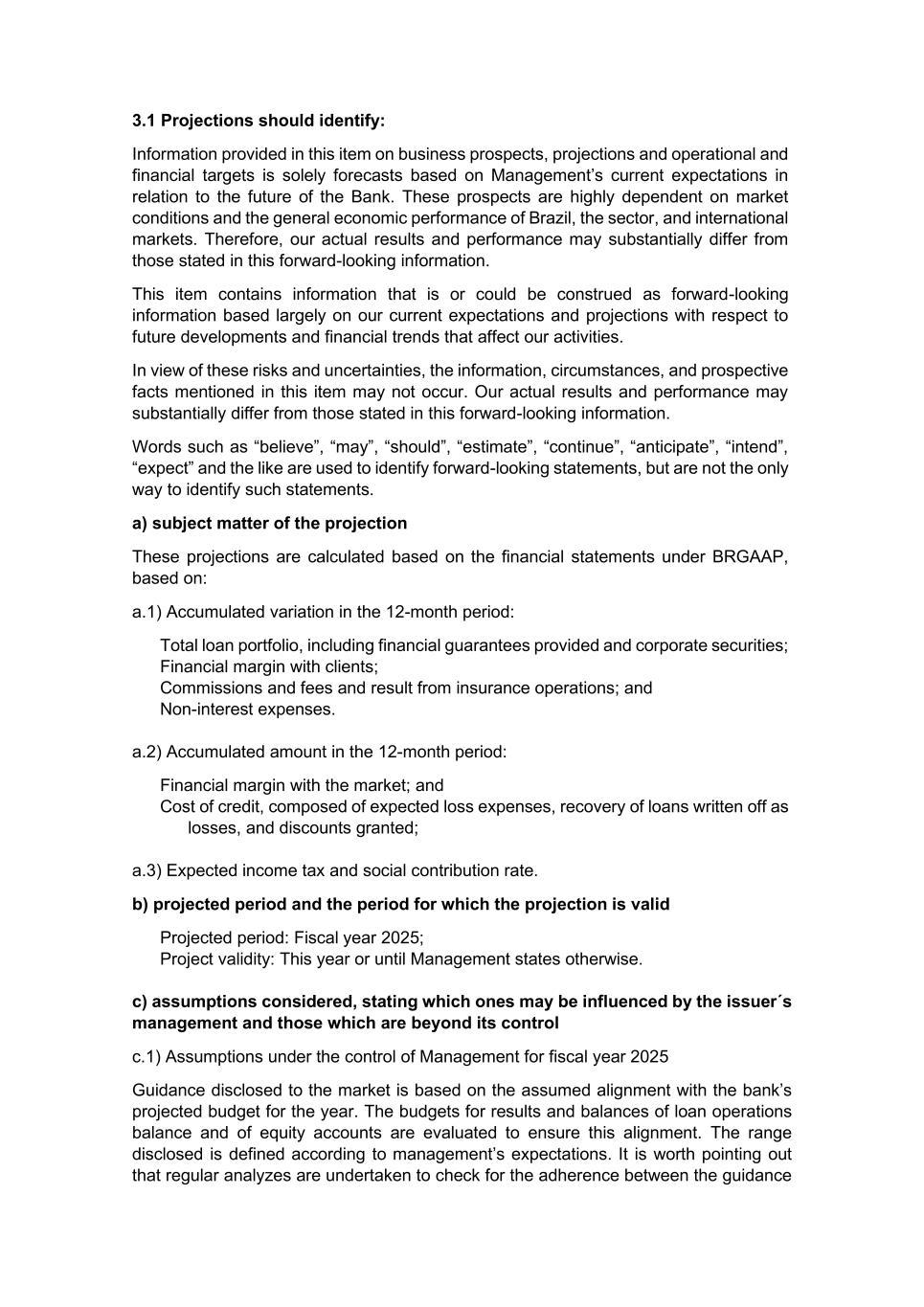 3.1 Projections should identify: Information provided in this item on business prospects, projections and operational and financial targets is solely forecasts based on Management’s current expectations in relation to the future of the Bank. These prospects are highly dependent on market conditions and the general economic performance of Brazil, the sector, and international markets. Therefore, our actual results and performance may substantially differ from those stated in this forward-looking information. This item contains information that is or could be construed as forward-looking information based largely on our current expectations and projections with respect to future developments and financial trends that affect our activities. In view of these risks and uncertainties, the information, circumstances, and prospective facts mentioned in this item may not occur. Our actual results and performance may substantially differ from those stated in this forward-looking information. Words such as “believe”, “may”, “should”, “estimate”, “continue”, “anticipate”, “intend”, “expect” and the like are used to identify forward-looking statements, but are not the only way to identify such statements. a) subject matter of the projection These projections are calculated based on the financial statements under BRGAAP, based on: a.1) Accumulated variation in the 12-month period: Total loan portfolio, including financial guarantees provided and corporate securities; Financial margin with clients; Commissions and fees and result from insurance operations; and Non-interest expenses. a.2) Accumulated amount in the 12-month period: Financial margin with the market; and Cost of credit, composed of expected loss expenses, recovery of loans written off as losses, and discounts granted; a.3) Expected income tax and social contribution rate. b) projected period and the period for which the projection is valid Projected period: Fiscal year 2025; Project validity: This year or until Management states otherwise. c) assumptions considered, stating which ones may be influenced by the issuer´s management and those which are beyond its control c.1) Assumptions under the control of Management for fiscal year 2025 Guidance disclosed to the market is based on the assumed alignment with the bank’s projected budget for the year. The budgets for results and balances of loan operations balance and of equity accounts are evaluated to ensure this alignment. The range disclosed is defined according to management’s expectations. It is worth pointing out that regular analyzes are undertaken to check for the adherence between the guidance