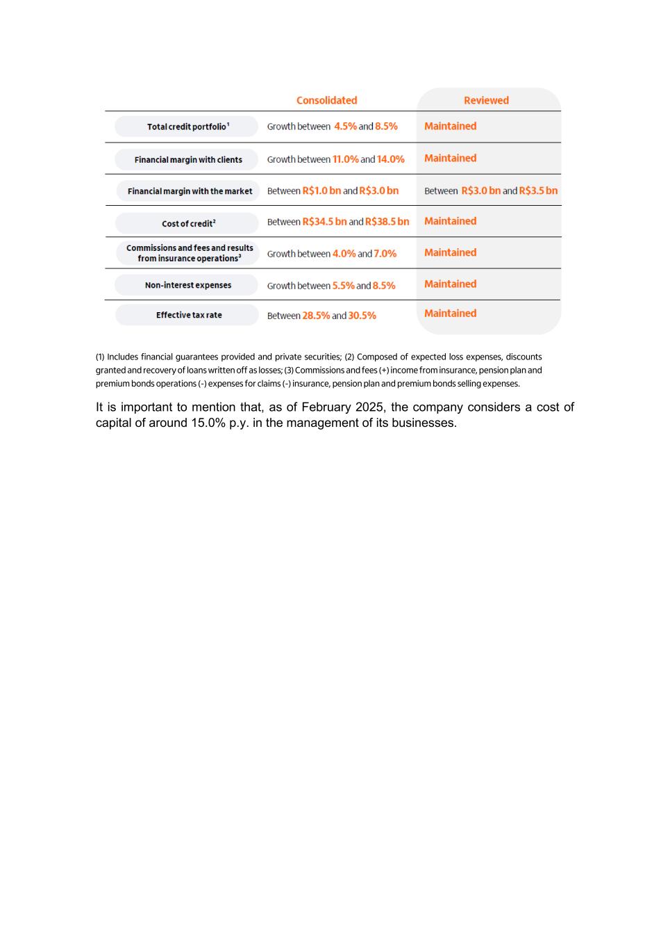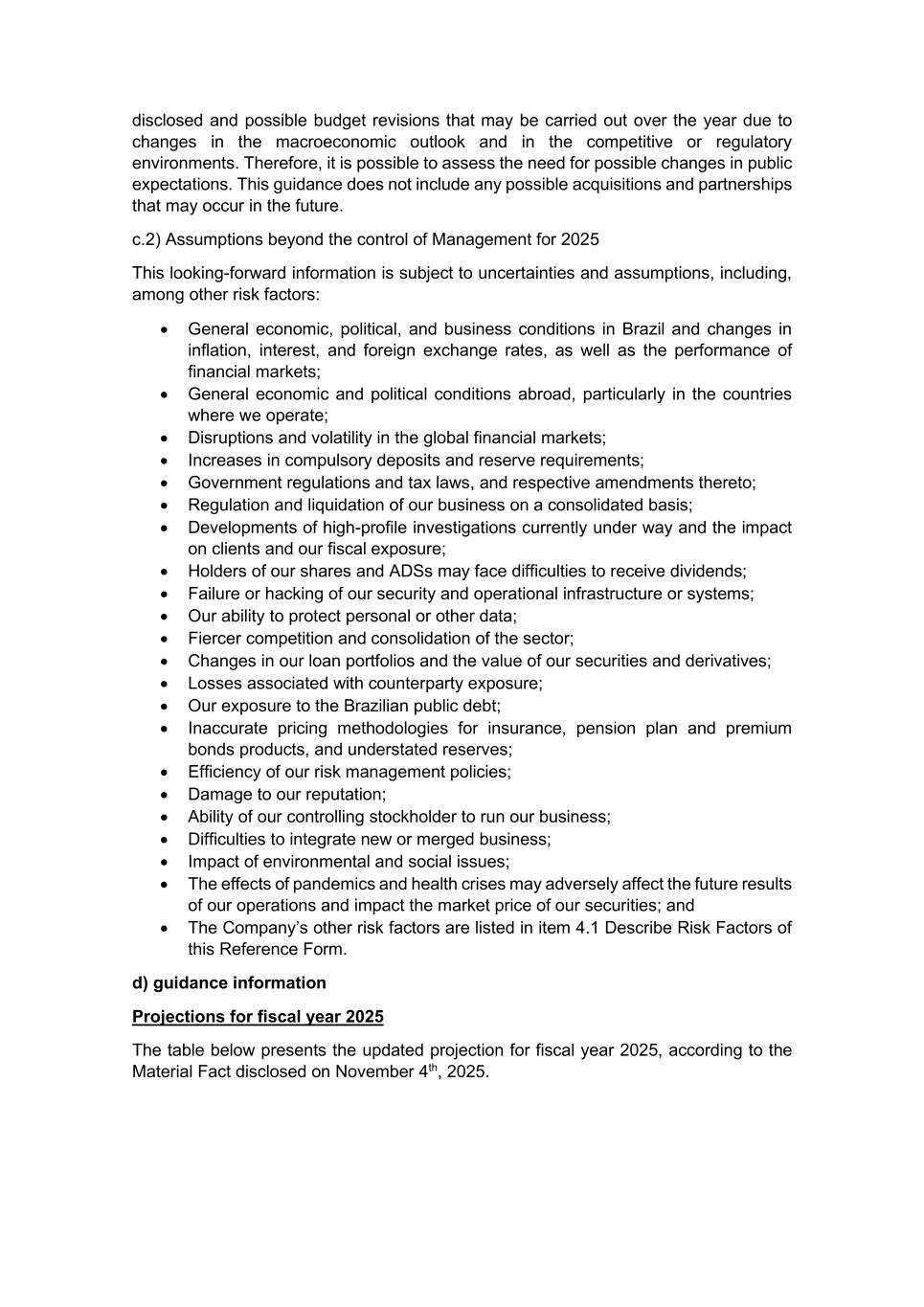 disclosed and possible budget revisions that may be carried out over the year due to changes in the macroeconomic outlook and in the competitive or regulatory environments. Therefore, it is possible to assess the need for possible changes in public expectations. This guidance does not include any possible acquisitions and partnerships that may occur in the future. c.2) Assumptions beyond the control of Management for 2025 This looking-forward information is subject to uncertainties and assumptions, including, among other risk factors: • General economic, political, and business conditions in Brazil and changes in inflation, interest, and foreign exchange rates, as well as the performance of financial markets; • General economic and political conditions abroad, particularly in the countries where we operate; • Disruptions and volatility in the global financial markets; • Increases in compulsory deposits and reserve requirements; • Government regulations and tax laws, and respective amendments thereto; • Regulation and liquidation of our business on a consolidated basis; • Developments of high-profile investigations currently under way and the impact on clients and our fiscal exposure; • Holders of our shares and ADSs may face difficulties to receive dividends; • Failure or hacking of our security and operational infrastructure or systems; • Our ability to protect personal or other data; • Fiercer competition and consolidation of the sector; • Changes in our loan portfolios and the value of our securities and derivatives; • Losses associated with counterparty exposure; • Our exposure to the Brazilian public debt; • Inaccurate pricing methodologies for insurance, pension plan and premium bonds products, and understated reserves; • Efficiency of our risk management policies; • Damage to our reputation; • Ability of our controlling stockholder to run our business; • Difficulties to integrate new or merged business; • Impact of environmental and social issues; • The effects of pandemics and health crises may adversely affect the future results of our operations and impact the market price of our securities; and • The Company’s other risk factors are listed in item 4.1 Describe Risk Factors of this Reference Form. d) guidance information Projections for fiscal year 2025 The table below presents the updated projection for fiscal year 2025, according to the Material Fact disclosed on November 4th, 2025.