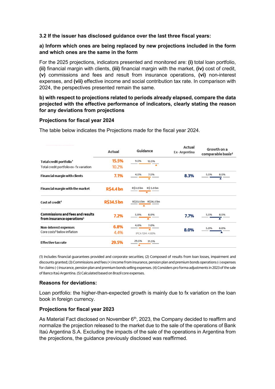 3.2 If the issuer has disclosed guidance over the last three fiscal years: a) Inform which ones are being replaced by new projections included in the form and which ones are the same in the form For the 2025 projections, indicators presented and monitored are: (i) total loan portfolio, (ii) financial margin with clients, (iii) financial margin with the market, (iv) cost of credit, (v) commissions and fees and result from insurance operations, (vi) non-interest expenses, and (vii) effective income and social contribution tax rate. In comparison with 2024, the perspectives presented remain the same. b) with respect to projections related to periods already elapsed, compare the data projected with the effective performance of indicators, clearly stating the reason for any deviations from projections Projections for fiscal year 2024 The table below indicates the Projections made for the fiscal year 2024. (1) Includes financial guarantees provided and corporate securities; (2) Composed of results from loan losses, impairment and discounts granted; (3) Commissions and fees (+) income from insurance, pension plan and premium bonds operations (-) expenses for claims (-) insurance, pension plan and premium bonds selling expenses. (4) Considers pro forma adjustments in 2023 of the sale of Banco Itaú Argentina. (5) Calculated based on Brazil core expenses. Reasons for deviations: Loan portfolio: the higher-than-expected growth is mainly due to fx variation on the loan book in foreign currency. Projections for fiscal year 2023 As Material Fact disclosed on November 6th, 2023, the Company decided to reaffirm and normalize the projection released to the market due to the sale of the operations of Bank Itaú Argentina S.A. Excluding the impacts of the sale of the operations in Argentina from the projections, the guidance previously disclosed was reaffirmed.