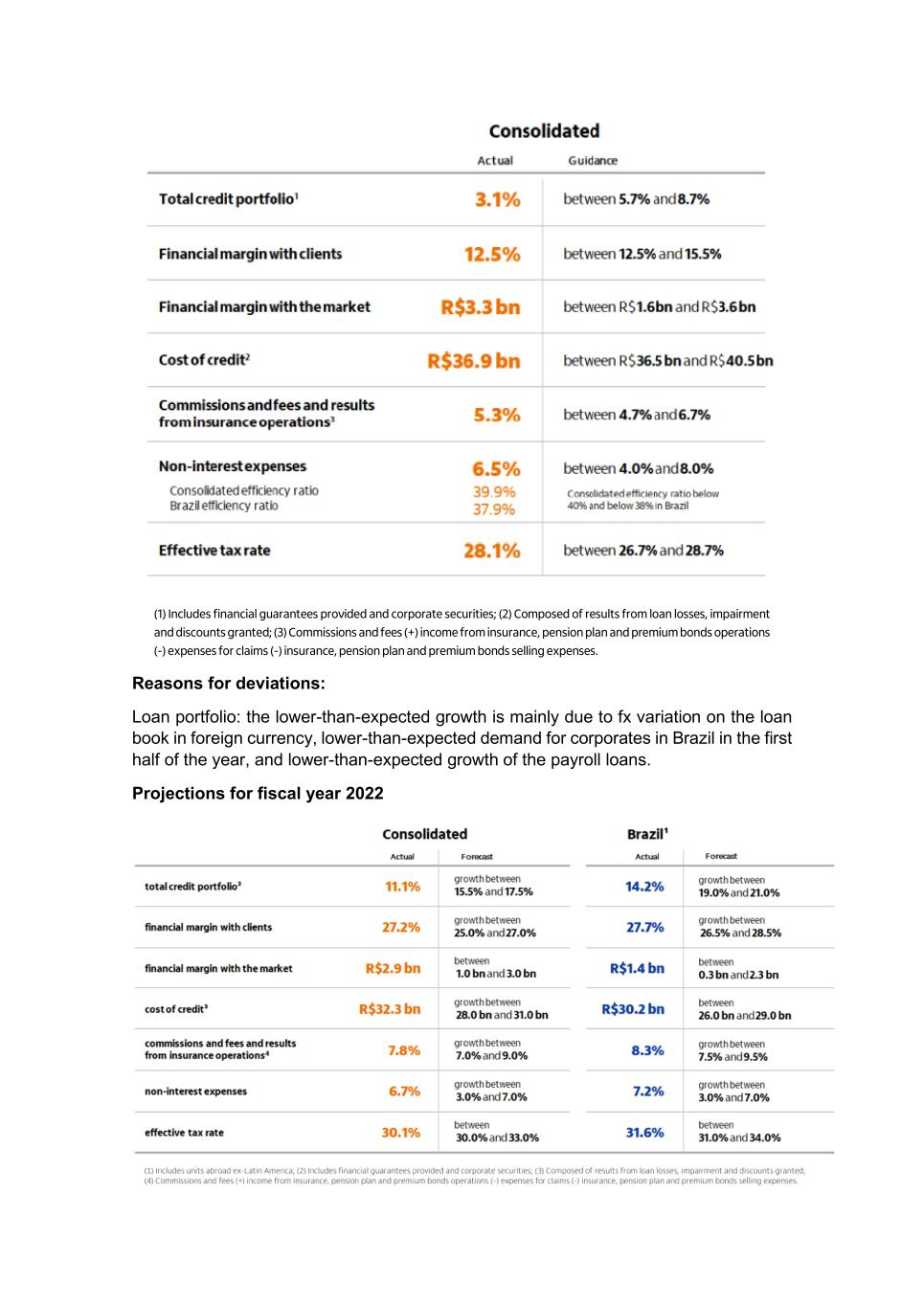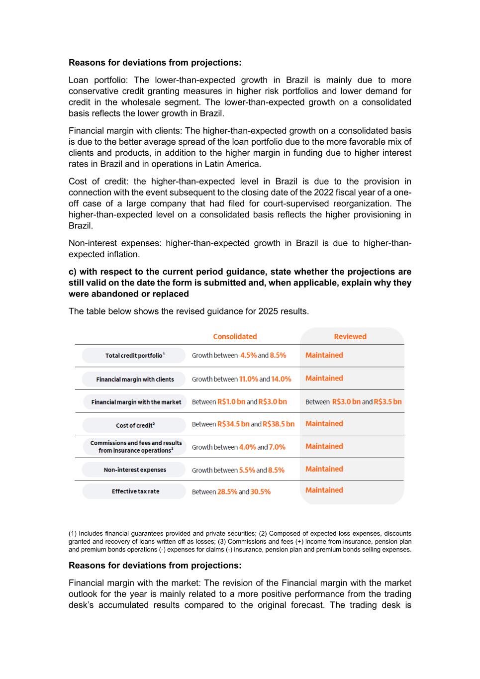 Reasons for deviations from projections: Loan portfolio: The lower-than-expected growth in Brazil is mainly due to more conservative credit granting measures in higher risk portfolios and lower demand for credit in the wholesale segment. The lower-than-expected growth on a consolidated basis reflects the lower growth in Brazil. Financial margin with clients: The higher-than-expected growth on a consolidated basis is due to the better average spread of the loan portfolio due to the more favorable mix of clients and products, in addition to the higher margin in funding due to higher interest rates in Brazil and in operations in Latin America. Cost of credit: the higher-than-expected level in Brazil is due to the provision in connection with the event subsequent to the closing date of the 2022 fiscal year of a one- off case of a large company that had filed for court-supervised reorganization. The higher-than-expected level on a consolidated basis reflects the higher provisioning in Brazil. Non-interest expenses: higher-than-expected growth in Brazil is due to higher-than- expected inflation. c) with respect to the current period guidance, state whether the projections are still valid on the date the form is submitted and, when applicable, explain why they were abandoned or replaced The table below shows the revised guidance for 2025 results. (1) Includes financial guarantees provided and private securities; (2) Composed of expected loss expenses, discounts granted and recovery of loans written off as losses; (3) Commissions and fees (+) income from insurance, pension plan and premium bonds operations (-) expenses for claims (-) insurance, pension plan and premium bonds selling expenses. Reasons for deviations from projections: Financial margin with the market: The revision of the Financial margin with the market outlook for the year is mainly related to a more positive performance from the trading desk’s accumulated results compared to the original forecast. The trading desk is