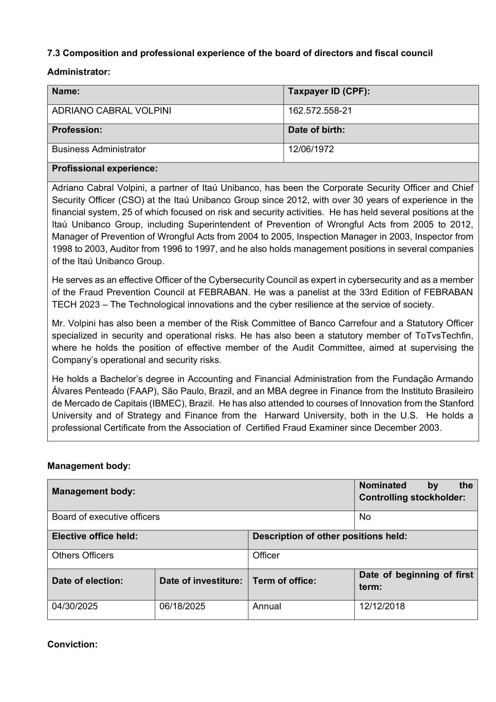 7.3 Composition and professional experience of the board of directors and fiscal council Administrator: Name: Taxpayer ID (CPF): ADRIANO CABRAL VOLPINI 162.572.558-21 Profession: Date of birth: Business Administrator 12/06/1972 Profissional experience: Adriano Cabral Volpini, a partner of Itaú Unibanco, has been the Corporate Security Officer and Chief Security Officer (CSO) at the Itaú Unibanco Group since 2012, with over 30 years of experience in the financial system, 25 of which focused on risk and security activities. He has held several positions at the Itaú Unibanco Group, including Superintendent of Prevention of Wrongful Acts from 2005 to 2012, Manager of Prevention of Wrongful Acts from 2004 to 2005, Inspection Manager in 2003, Inspector from 1998 to 2003, Auditor from 1996 to 1997, and he also holds management positions in several companies of the Itaú Unibanco Group. He serves as an effective Officer of the Cybersecurity Council as expert in cybersecurity and as a member of the Fraud Prevention Council at FEBRABAN. He was a panelist at the 33rd Edition of FEBRABAN TECH 2023 – The Technological innovations and the cyber resilience at the service of society. Mr. Volpini has also been a member of the Risk Committee of Banco Carrefour and a Statutory Officer specialized in security and operational risks. He has also been a statutory member of ToTvsTechfin, where he holds the position of effective member of the Audit Committee, aimed at supervising the Company’s operational and security risks. He holds a Bachelor’s degree in Accounting and Financial Administration from the Fundação Armando Álvares Penteado (FAAP), São Paulo, Brazil, and an MBA degree in Finance from the Instituto Brasileiro de Mercado de Capitais (IBMEC), Brazil. He has also attended to courses of Innovation from the Stanford University and of Strategy and Finance from the Harward University, both in the U.S. He holds a professional Certificate from the Association of Certified Fraud Examiner since December 2003. Management body: Management body: Nominated by the Controlling stockholder: Board of executive officers No Elective office held: Description of other positions held: Others Officers Officer Date of election: Date of investiture: Term of office: Date of beginning of first term: 04/30/2025 06/18/2025 Annual 12/12/2018 Conviction: