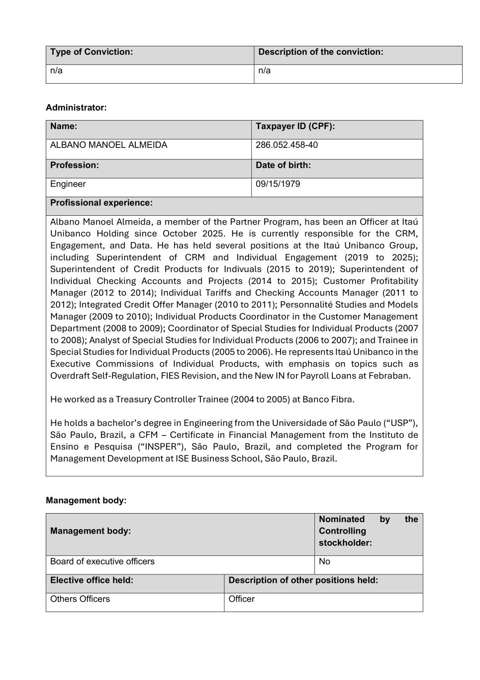 Type of Conviction: Description of the conviction: n/a n/a Administrator: Name: Taxpayer ID (CPF): ALBANO MANOEL ALMEIDA 286.052.458-40 Profession: Date of birth: Engineer 09/15/1979 Profissional experience: Albano Manoel Almeida, a member of the Partner Program, has been an Officer at Itaú Unibanco Holding since October 2025. He is currently responsible for the CRM, Engagement, and Data. He has held several positions at the Itaú Unibanco Group, including Superintendent of CRM and Individual Engagement (2019 to 2025); Superintendent of Credit Products for Indivuals (2015 to 2019); Superintendent of Individual Checking Accounts and Projects (2014 to 2015); Customer Profitability Manager (2012 to 2014); Individual Tariffs and Checking Accounts Manager (2011 to 2012); Integrated Credit Offer Manager (2010 to 2011); Personnalité Studies and Models Manager (2009 to 2010); Individual Products Coordinator in the Customer Management Department (2008 to 2009); Coordinator of Special Studies for Individual Products (2007 to 2008); Analyst of Special Studies for Individual Products (2006 to 2007); and Trainee in Special Studies for Individual Products (2005 to 2006). He represents Itaú Unibanco in the Executive Commissions of Individual Products, with emphasis on topics such as Overdraft Self-Regulation, FIES Revision, and the New IN for Payroll Loans at Febraban. He worked as a Treasury Controller Trainee (2004 to 2005) at Banco Fibra. He holds a bachelor’s degree in Engineering from the Universidade of São Paulo (“USP”), São Paulo, Brazil, a CFM – Certificate in Financial Management from the Instituto de Ensino e Pesquisa (“INSPER”), São Paulo, Brazil, and completed the Program for Management Development at ISE Business School, São Paulo, Brazil. Management body: Management body: Nominated by the Controlling stockholder: Board of executive officers No Elective office held: Description of other positions held: Others Officers Officer