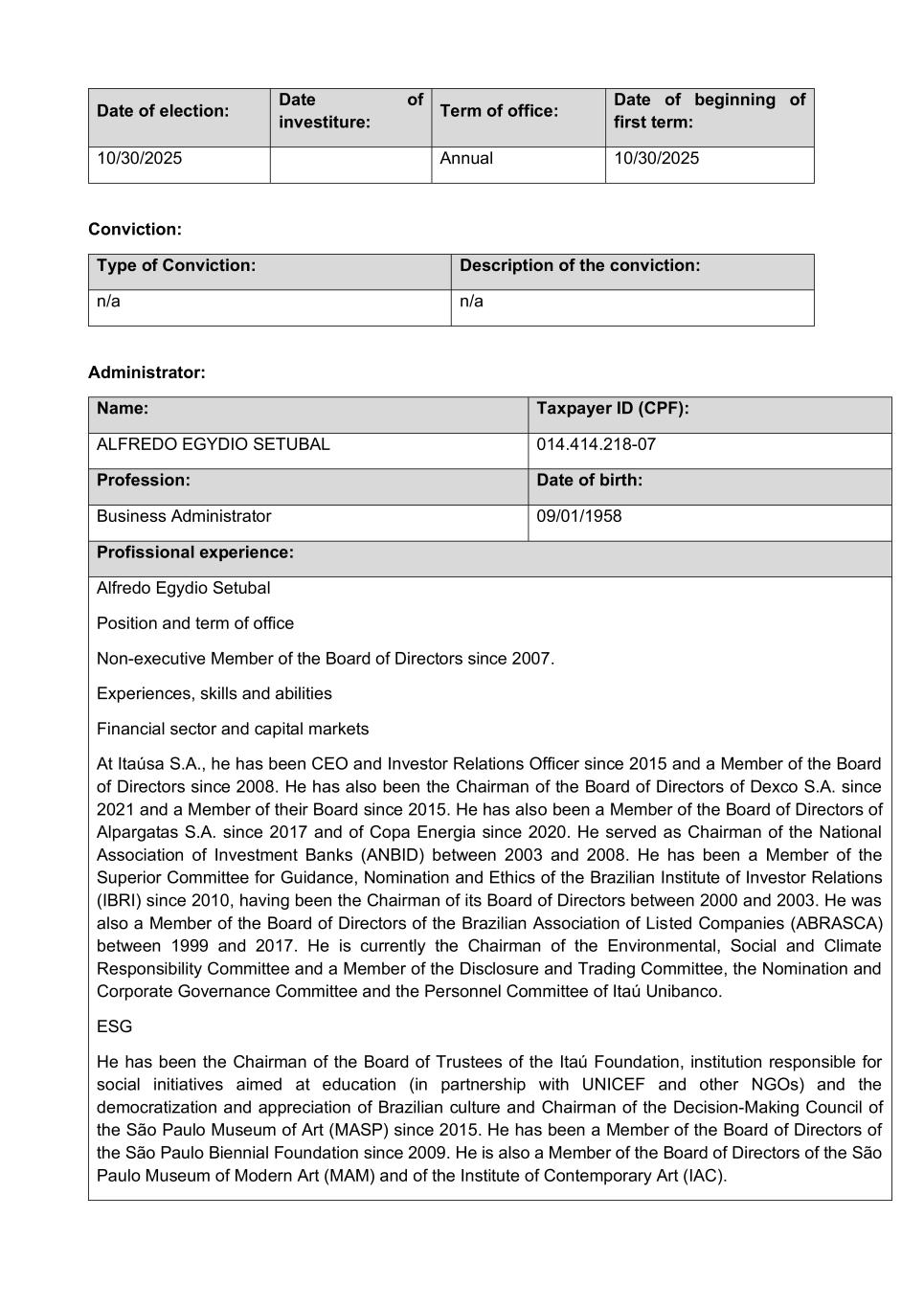 Date of election: Date of investiture: Term of office: Date of beginning of first term: 10/30/2025 Annual 10/30/2025 Conviction: Type of Conviction: Description of the conviction: n/a n/a Administrator: Name: Taxpayer ID (CPF): ALFREDO EGYDIO SETUBAL 014.414.218-07 Profession: Date of birth: Business Administrator 09/01/1958 Profissional experience: Alfredo Egydio Setubal Position and term of office Non-executive Member of the Board of Directors since 2007. Experiences, skills and abilities Financial sector and capital markets At Itaúsa S.A., he has been CEO and Investor Relations Officer since 2015 and a Member of the Board of Directors since 2008. He has also been the Chairman of the Board of Directors of Dexco S.A. since 2021 and a Member of their Board since 2015. He has also been a Member of the Board of Directors of Alpargatas S.A. since 2017 and of Copa Energia since 2020. He served as Chairman of the National Association of Investment Banks (ANBID) between 2003 and 2008. He has been a Member of the Superior Committee for Guidance, Nomination and Ethics of the Brazilian Institute of Investor Relations (IBRI) since 2010, having been the Chairman of its Board of Directors between 2000 and 2003. He was also a Member of the Board of Directors of the Brazilian Association of Listed Companies (ABRASCA) between 1999 and 2017. He is currently the Chairman of the Environmental, Social and Climate Responsibility Committee and a Member of the Disclosure and Trading Committee, the Nomination and Corporate Governance Committee and the Personnel Committee of Itaú Unibanco. ESG He has been the Chairman of the Board of Trustees of the Itaú Foundation, institution responsible for social initiatives aimed at education (in partnership with UNICEF and other NGOs) and the democratization and appreciation of Brazilian culture and Chairman of the Decision-Making Council of the São Paulo Museum of Art (MASP) since 2015. He has been a Member of the Board of Directors of the São Paulo Biennial Foundation since 2009. He is also a Member of the Board of Directors of the São Paulo Museum of Modern Art (MAM) and of the Institute of Contemporary Art (IAC).