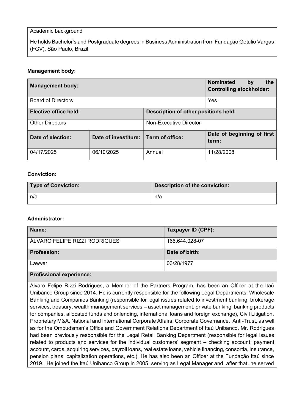 Academic background He holds Bachelor’s and Postgraduate degrees in Business Administration from Fundação Getulio Vargas (FGV), São Paulo, Brazil. Management body: Management body: Nominated by the Controlling stockholder: Board of Directors Yes Elective office held: Description of other positions held: Other Directors Non-Executive Director Date of election: Date of investiture: Term of office: Date of beginning of first term: 04/17/2025 06/10/2025 Annual 11/28/2008 Conviction: Type of Conviction: Description of the conviction: n/a n/a Administrator: Name: Taxpayer ID (CPF): ÁLVARO FELIPE RIZZI RODRIGUES 166.644.028-07 Profession: Date of birth: Lawyer 03/28/1977 Profissional experience: Álvaro Felipe Rizzi Rodrigues, a Member of the Partners Program, has been an Officer at the Itaú Unibanco Group since 2014. He is currently responsible for the following Legal Departments: Wholesale Banking and Companies Banking (responsible for legal issues related to investment banking, brokerage services, treasury, wealth management services – asset management, private banking, banking products for companies, allocated funds and onlending, international loans and foreign exchange), Civil Litigation, Proprietary M&A, National and International Corporate Affairs, Corporate Governance, Anti-Trust, as well as for the Ombudsman’s Office and Government Relations Department of Itaú Unibanco. Mr. Rodrigues had been previously responsible for the Legal Retail Banking Department (responsible for legal issues related to products and services for the individual customers’ segment – checking account, payment account, cards, acquiring services, payroll loans, real estate loans, vehicle financing, consortia, insurance, pension plans, capitalization operations, etc.). He has also been an Officer at the Fundação Itaú since 2019. He joined the Itaú Unibanco Group in 2005, serving as Legal Manager and, after that, he served