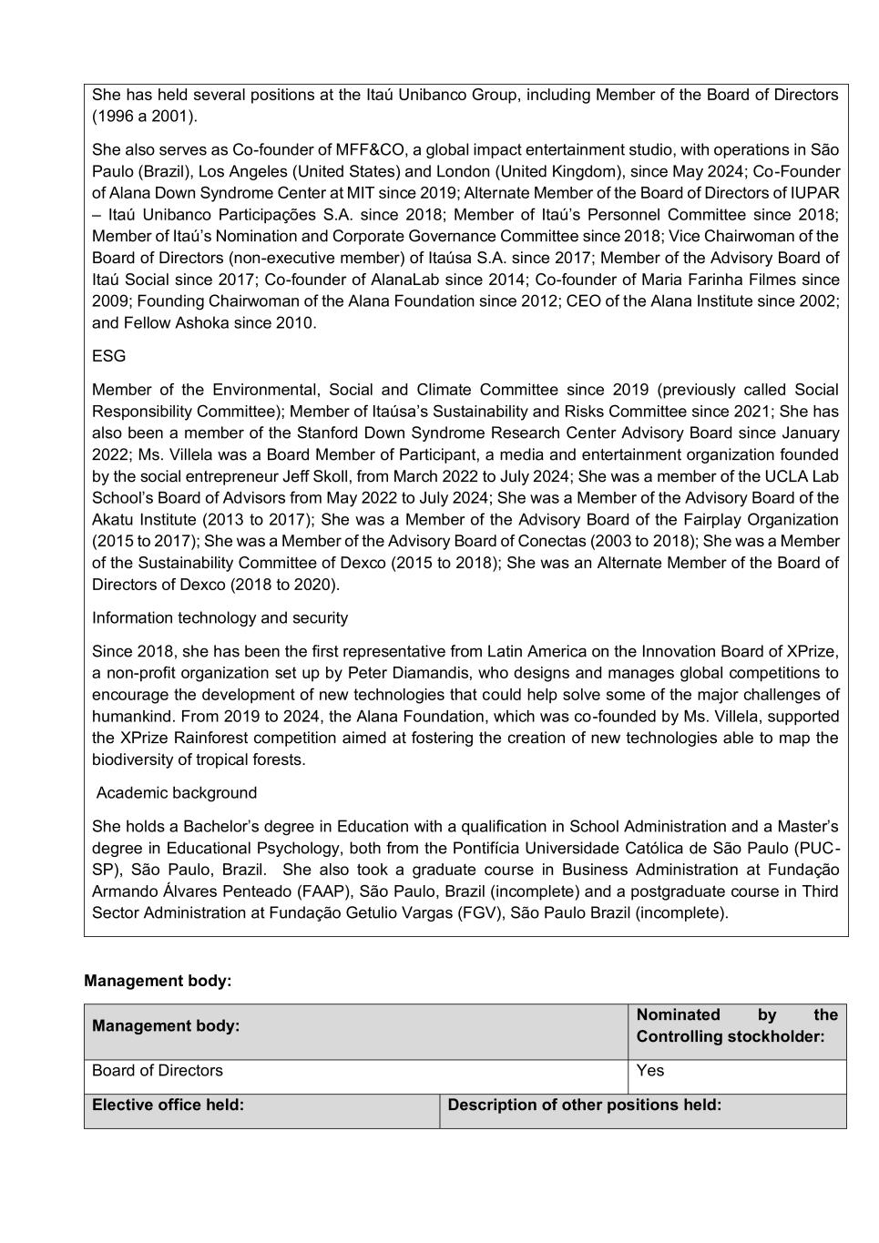 She has held several positions at the Itaú Unibanco Group, including Member of the Board of Directors (1996 a 2001). She also serves as Co-founder of MFF&CO, a global impact entertainment studio, with operations in São Paulo (Brazil), Los Angeles (United States) and London (United Kingdom), since May 2024; Co-Founder of Alana Down Syndrome Center at MIT since 2019; Alternate Member of the Board of Directors of IUPAR – Itaú Unibanco Participações S.A. since 2018; Member of Itaú’s Personnel Committee since 2018; Member of Itaú’s Nomination and Corporate Governance Committee since 2018; Vice Chairwoman of the Board of Directors (non-executive member) of Itaúsa S.A. since 2017; Member of the Advisory Board of Itaú Social since 2017; Co-founder of AlanaLab since 2014; Co-founder of Maria Farinha Filmes since 2009; Founding Chairwoman of the Alana Foundation since 2012; CEO of the Alana Institute since 2002; and Fellow Ashoka since 2010. ESG Member of the Environmental, Social and Climate Committee since 2019 (previously called Social Responsibility Committee); Member of Itaúsa’s Sustainability and Risks Committee since 2021; She has also been a member of the Stanford Down Syndrome Research Center Advisory Board since January 2022; Ms. Villela was a Board Member of Participant, a media and entertainment organization founded by the social entrepreneur Jeff Skoll, from March 2022 to July 2024; She was a member of the UCLA Lab School’s Board of Advisors from May 2022 to July 2024; She was a Member of the Advisory Board of the Akatu Institute (2013 to 2017); She was a Member of the Advisory Board of the Fairplay Organization (2015 to 2017); She was a Member of the Advisory Board of Conectas (2003 to 2018); She was a Member of the Sustainability Committee of Dexco (2015 to 2018); She was an Alternate Member of the Board of Directors of Dexco (2018 to 2020). Information technology and security Since 2018, she has been the first representative from Latin America on the Innovation Board of XPrize, a non-profit organization set up by Peter Diamandis, who designs and manages global competitions to encourage the development of new technologies that could help solve some of the major challenges of humankind. From 2019 to 2024, the Alana Foundation, which was co-founded by Ms. Villela, supported the XPrize Rainforest competition aimed at fostering the creation of new technologies able to map the biodiversity of tropical forests. Academic background She holds a Bachelor’s degree in Education with a qualification in School Administration and a Master’s degree in Educational Psychology, both from the Pontifícia Universidade Católica de São Paulo (PUC- SP), São Paulo, Brazil. She also took a graduate course in Business Administration at Fundação Armando Álvares Penteado (FAAP), São Paulo, Brazil (incomplete) and a postgraduate course in Third Sector Administration at Fundação Getulio Vargas (FGV), São Paulo Brazil (incomplete). Management body: Management body: Nominated by the Controlling stockholder: Board of Directors Yes Elective office held: Description of other positions held: