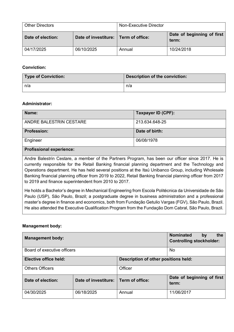 Other Directors Non-Executive Director Date of election: Date of investiture: Term of office: Date of beginning of first term: 04/17/2025 06/10/2025 Annual 10/24/2018 Conviction: Type of Conviction: Description of the conviction: n/a n/a Administrator: Name: Taxpayer ID (CPF): ANDRE BALESTRIN CESTARE 213.634.648-25 Profession: Date of birth: Engineer 06/08/1978 Profissional experience: Andre Balestrin Cestare, a member of the Partners Program, has been our officer since 2017. He is currently responsible for the Retail Banking financial planning department and the Technology and Operations department. He has held several positions at the Itaú Unibanco Group, including Wholesale Banking financial planning officer from 2019 to 2022, Retail Banking financial planning officer from 2017 to 2019 and finance superintendent from 2010 to 2017. He holds a Bachelor’s degree in Mechanical Engineering from Escola Politécnica da Universidade de São Paulo (USP), São Paulo, Brazil; a postgraduate degree in business administration and a professional master’s degree in finance and economics, both from Fundação Getulio Vargas (FGV), São Paulo, Brazil. He also attended the Executive Qualification Program from the Fundação Dom Cabral, São Paulo, Brazil. Management body: Management body: Nominated by the Controlling stockholder: Board of executive officers No Elective office held: Description of other positions held: Others Officers Officer Date of election: Date of investiture: Term of office: Date of beginning of first term: 04/30/2025 06/18/2025 Annual 11/06/2017