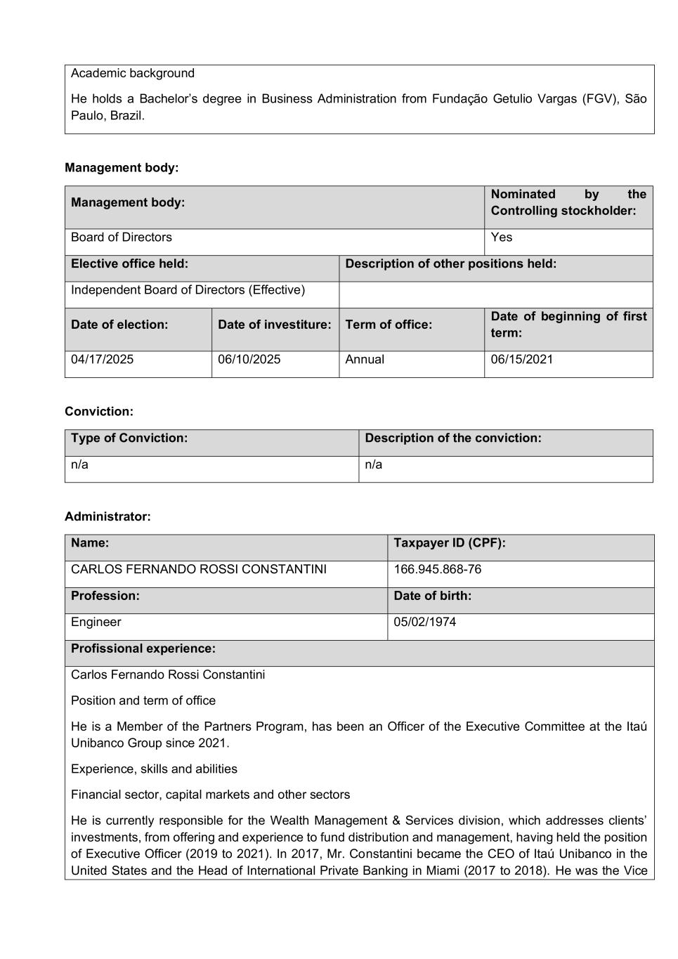 Academic background He holds a Bachelor’s degree in Business Administration from Fundação Getulio Vargas (FGV), São Paulo, Brazil. Management body: Management body: Nominated by the Controlling stockholder: Board of Directors Yes Elective office held: Description of other positions held: Independent Board of Directors (Effective) Date of election: Date of investiture: Term of office: Date of beginning of first term: 04/17/2025 06/10/2025 Annual 06/15/2021 Conviction: Type of Conviction: Description of the conviction: n/a n/a Administrator: Name: Taxpayer ID (CPF): CARLOS FERNANDO ROSSI CONSTANTINI 166.945.868-76 Profession: Date of birth: Engineer 05/02/1974 Profissional experience: Carlos Fernando Rossi Constantini Position and term of office He is a Member of the Partners Program, has been an Officer of the Executive Committee at the Itaú Unibanco Group since 2021. Experience, skills and abilities Financial sector, capital markets and other sectors He is currently responsible for the Wealth Management & Services division, which addresses clients’ investments, from offering and experience to fund distribution and management, having held the position of Executive Officer (2019 to 2021). In 2017, Mr. Constantini became the CEO of Itaú Unibanco in the United States and the Head of International Private Banking in Miami (2017 to 2018). He was the Vice