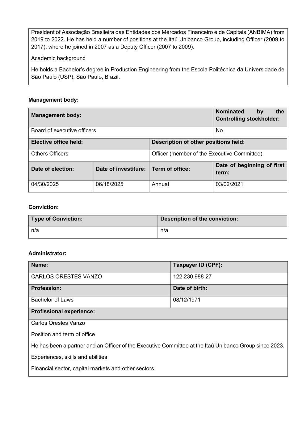 President of Associação Brasileira das Entidades dos Mercados Financeiro e de Capitais (ANBIMA) from 2019 to 2022. He has held a number of positions at the Itaú Unibanco Group, including Officer (2009 to 2017), where he joined in 2007 as a Deputy Officer (2007 to 2009). Academic background He holds a Bachelor’s degree in Production Engineering from the Escola Politécnica da Universidade de São Paulo (USP), São Paulo, Brazil. Management body: Management body: Nominated by the Controlling stockholder: Board of executive officers No Elective office held: Description of other positions held: Others Officers Officer (member of the Executive Committee) Date of election: Date of investiture: Term of office: Date of beginning of first term: 04/30/2025 06/18/2025 Annual 03/02/2021 Conviction: Type of Conviction: Description of the conviction: n/a n/a Administrator: Name: Taxpayer ID (CPF): CARLOS ORESTES VANZO 122.230.988-27 Profession: Date of birth: Bachelor of Laws 08/12/1971 Profissional experience: Carlos Orestes Vanzo Position and term of office He has been a partner and an Officer of the Executive Committee at the Itaú Unibanco Group since 2023. Experiences, skills and abilities Financial sector, capital markets and other sectors