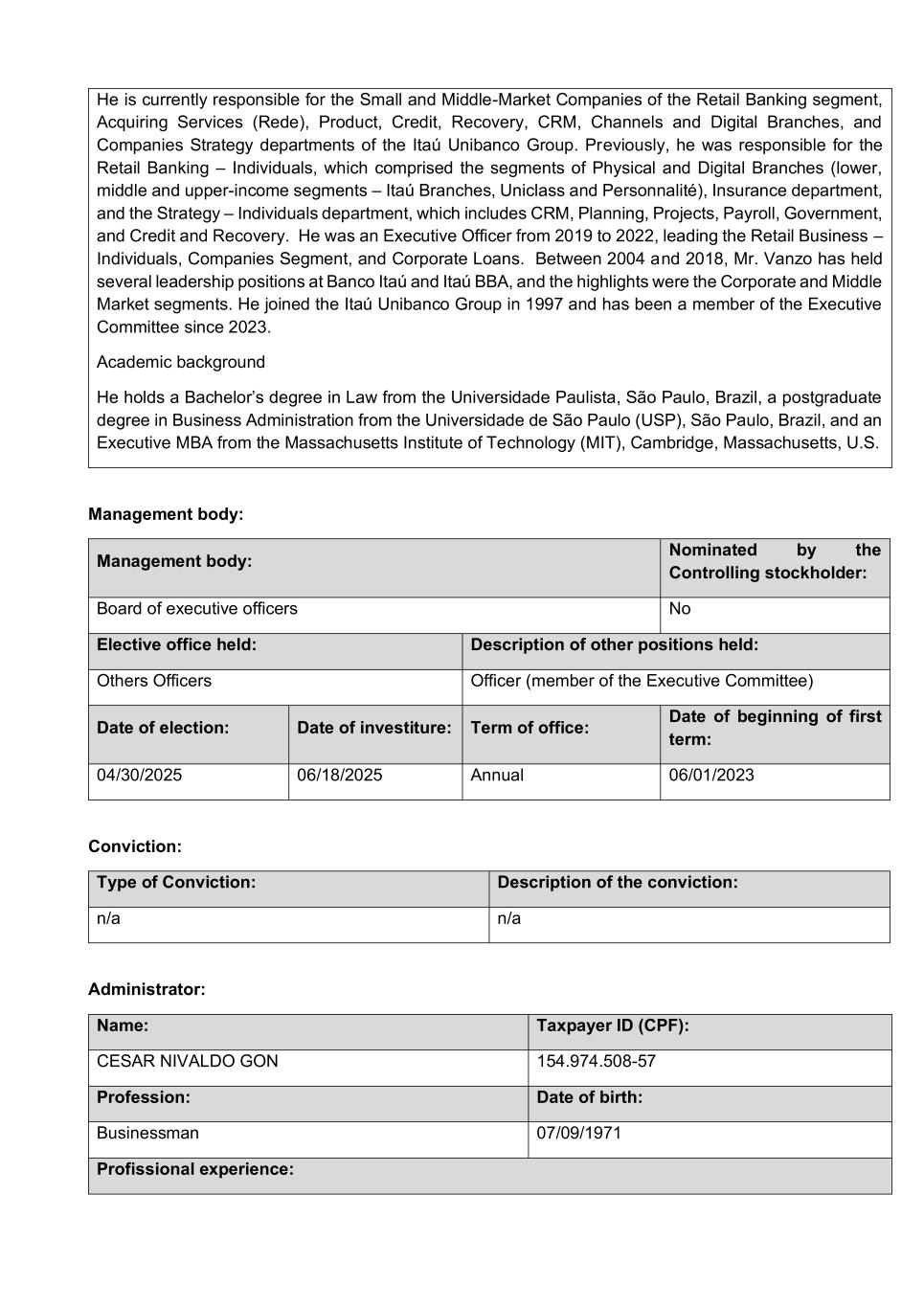 He is currently responsible for the Small and Middle-Market Companies of the Retail Banking segment, Acquiring Services (Rede), Product, Credit, Recovery, CRM, Channels and Digital Branches, and Companies Strategy departments of the Itaú Unibanco Group. Previously, he was responsible for the Retail Banking – Individuals, which comprised the segments of Physical and Digital Branches (lower, middle and upper-income segments – Itaú Branches, Uniclass and Personnalité), Insurance department, and the Strategy – Individuals department, which includes CRM, Planning, Projects, Payroll, Government, and Credit and Recovery. He was an Executive Officer from 2019 to 2022, leading the Retail Business – Individuals, Companies Segment, and Corporate Loans. Between 2004 and 2018, Mr. Vanzo has held several leadership positions at Banco Itaú and Itaú BBA, and the highlights were the Corporate and Middle Market segments. He joined the Itaú Unibanco Group in 1997 and has been a member of the Executive Committee since 2023. Academic background He holds a Bachelor’s degree in Law from the Universidade Paulista, São Paulo, Brazil, a postgraduate degree in Business Administration from the Universidade de São Paulo (USP), São Paulo, Brazil, and an Executive MBA from the Massachusetts Institute of Technology (MIT), Cambridge, Massachusetts, U.S. Management body: Management body: Nominated by the Controlling stockholder: Board of executive officers No Elective office held: Description of other positions held: Others Officers Officer (member of the Executive Committee) Date of election: Date of investiture: Term of office: Date of beginning of first term: 04/30/2025 06/18/2025 Annual 06/01/2023 Conviction: Type of Conviction: Description of the conviction: n/a n/a Administrator: Name: Taxpayer ID (CPF): CESAR NIVALDO GON 154.974.508-57 Profession: Date of birth: Businessman 07/09/1971 Profissional experience: