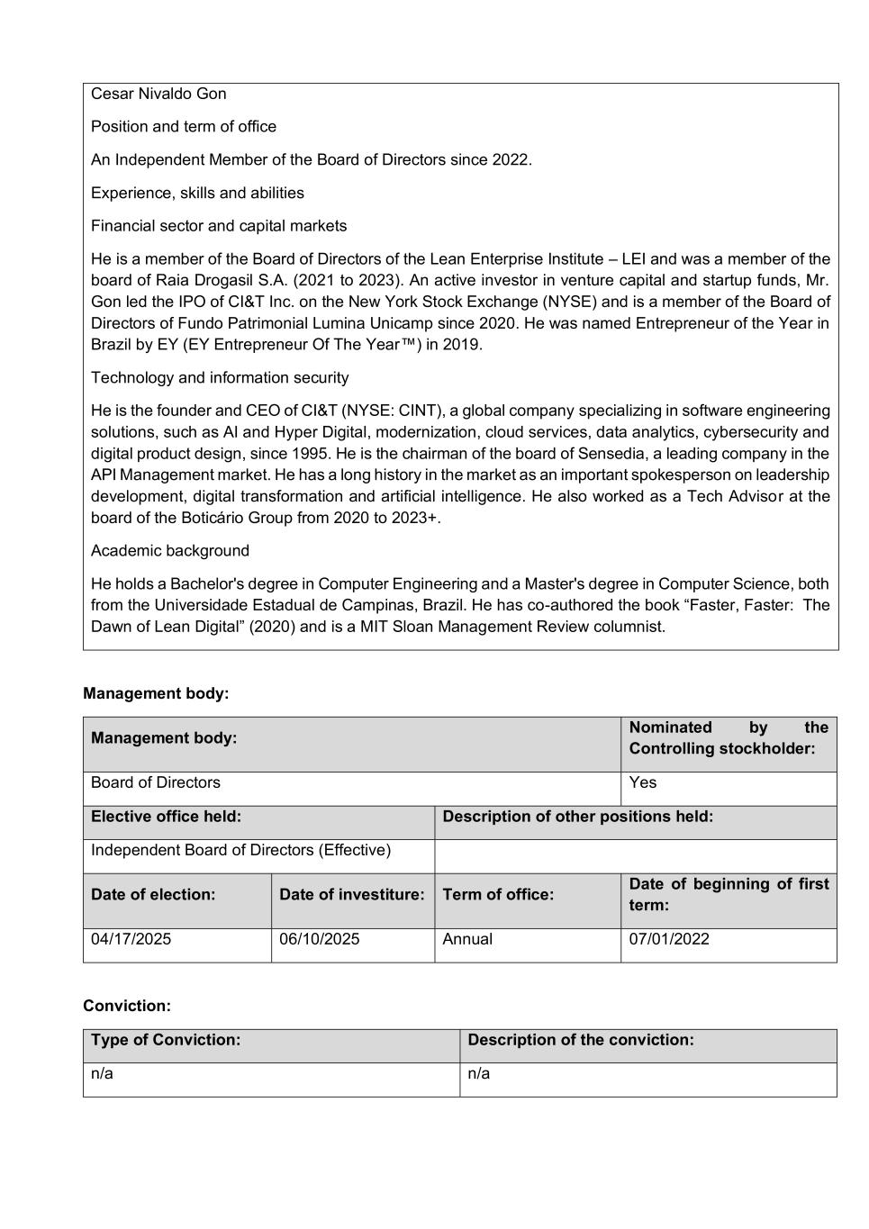 Cesar Nivaldo Gon Position and term of office An Independent Member of the Board of Directors since 2022. Experience, skills and abilities Financial sector and capital markets He is a member of the Board of Directors of the Lean Enterprise Institute – LEI and was a member of the board of Raia Drogasil S.A. (2021 to 2023). An active investor in venture capital and startup funds, Mr. Gon led the IPO of CI&T Inc. on the New York Stock Exchange (NYSE) and is a member of the Board of Directors of Fundo Patrimonial Lumina Unicamp since 2020. He was named Entrepreneur of the Year in Brazil by EY (EY Entrepreneur Of The Year™) in 2019. Technology and information security He is the founder and CEO of CI&T (NYSE: CINT), a global company specializing in software engineering solutions, such as AI and Hyper Digital, modernization, cloud services, data analytics, cybersecurity and digital product design, since 1995. He is the chairman of the board of Sensedia, a leading company in the API Management market. He has a long history in the market as an important spokesperson on leadership development, digital transformation and artificial intelligence. He also worked as a Tech Advisor at the board of the Boticário Group from 2020 to 2023+. Academic background He holds a Bachelor's degree in Computer Engineering and a Master's degree in Computer Science, both from the Universidade Estadual de Campinas, Brazil. He has co-authored the book “Faster, Faster: The Dawn of Lean Digital” (2020) and is a MIT Sloan Management Review columnist. Management body: Management body: Nominated by the Controlling stockholder: Board of Directors Yes Elective office held: Description of other positions held: Independent Board of Directors (Effective) Date of election: Date of investiture: Term of office: Date of beginning of first term: 04/17/2025 06/10/2025 Annual 07/01/2022 Conviction: Type of Conviction: Description of the conviction: n/a n/a