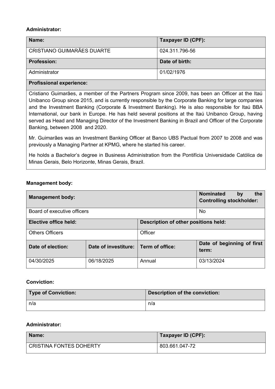 Administrator: Name: Taxpayer ID (CPF): CRISTIANO GUIMARÃES DUARTE 024.311.796-56 Profession: Date of birth: Administrator 01/02/1976 Profissional experience: Cristiano Guimarães, a member of the Partners Program since 2009, has been an Officer at the Itaú Unibanco Group since 2015, and is currently responsible by the Corporate Banking for large companies and the Investment Banking (Corporate & Investment Banking). He is also responsible for Itaú BBA International, our bank in Europe. He has held several positions at the Itaú Unibanco Group, having served as Head and Managing Director of the Investment Banking in Brazil and Officer of the Corporate Banking, between 2008 and 2020. Mr. Guimarães was an Investment Banking Officer at Banco UBS Pactual from 2007 to 2008 and was previously a Managing Partner at KPMG, where he started his career. He holds a Bachelor’s degree in Business Administration from the Pontifícia Universidade Católica de Minas Gerais, Belo Horizonte, Minas Gerais, Brazil. Management body: Management body: Nominated by the Controlling stockholder: Board of executive officers No Elective office held: Description of other positions held: Others Officers Officer Date of election: Date of investiture: Term of office: Date of beginning of first term: 04/30/2025 06/18/2025 Annual 03/13/2024 Conviction: Type of Conviction: Description of the conviction: n/a n/a Administrator: Name: Taxpayer ID (CPF): CRISTINA FONTES DOHERTY 803.661.047-72