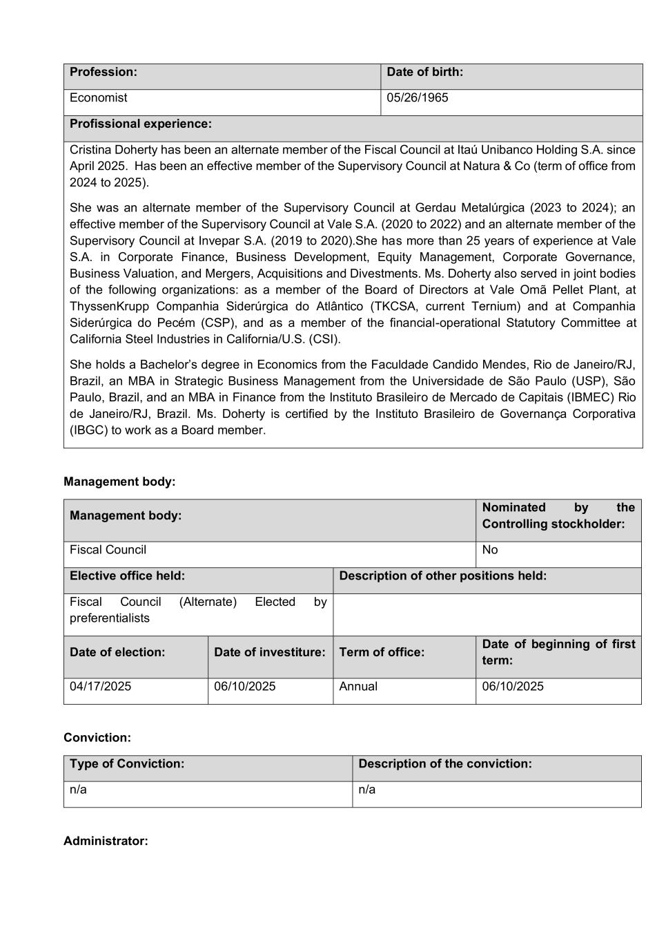 Profession: Date of birth: Economist 05/26/1965 Profissional experience: Cristina Doherty has been an alternate member of the Fiscal Council at Itaú Unibanco Holding S.A. since April 2025. Has been an effective member of the Supervisory Council at Natura & Co (term of office from 2024 to 2025). She was an alternate member of the Supervisory Council at Gerdau Metalúrgica (2023 to 2024); an effective member of the Supervisory Council at Vale S.A. (2020 to 2022) and an alternate member of the Supervisory Council at Invepar S.A. (2019 to 2020).She has more than 25 years of experience at Vale S.A. in Corporate Finance, Business Development, Equity Management, Corporate Governance, Business Valuation, and Mergers, Acquisitions and Divestments. Ms. Doherty also served in joint bodies of the following organizations: as a member of the Board of Directors at Vale Omã Pellet Plant, at ThyssenKrupp Companhia Siderúrgica do Atlântico (TKCSA, current Ternium) and at Companhia Siderúrgica do Pecém (CSP), and as a member of the financial-operational Statutory Committee at California Steel Industries in California/U.S. (CSI). She holds a Bachelor’s degree in Economics from the Faculdade Candido Mendes, Rio de Janeiro/RJ, Brazil, an MBA in Strategic Business Management from the Universidade de São Paulo (USP), São Paulo, Brazil, and an MBA in Finance from the Instituto Brasileiro de Mercado de Capitais (IBMEC) Rio de Janeiro/RJ, Brazil. Ms. Doherty is certified by the Instituto Brasileiro de Governança Corporativa (IBGC) to work as a Board member. Management body: Management body: Nominated by the Controlling stockholder: Fiscal Council No Elective office held: Description of other positions held: Fiscal Council (Alternate) Elected by preferentialists Date of election: Date of investiture: Term of office: Date of beginning of first term: 04/17/2025 06/10/2025 Annual 06/10/2025 Conviction: Type of Conviction: Description of the conviction: n/a n/a Administrator: