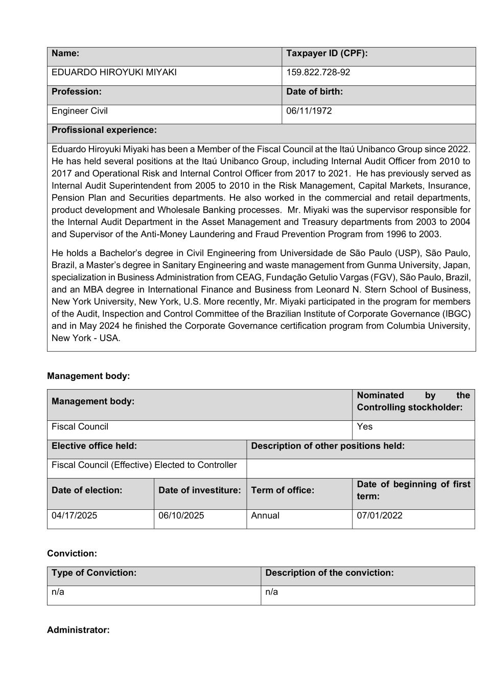 Name: Taxpayer ID (CPF): EDUARDO HIROYUKI MIYAKI 159.822.728-92 Profession: Date of birth: Engineer Civil 06/11/1972 Profissional experience: Eduardo Hiroyuki Miyaki has been a Member of the Fiscal Council at the Itaú Unibanco Group since 2022. He has held several positions at the Itaú Unibanco Group, including Internal Audit Officer from 2010 to 2017 and Operational Risk and Internal Control Officer from 2017 to 2021. He has previously served as Internal Audit Superintendent from 2005 to 2010 in the Risk Management, Capital Markets, Insurance, Pension Plan and Securities departments. He also worked in the commercial and retail departments, product development and Wholesale Banking processes. Mr. Miyaki was the supervisor responsible for the Internal Audit Department in the Asset Management and Treasury departments from 2003 to 2004 and Supervisor of the Anti-Money Laundering and Fraud Prevention Program from 1996 to 2003. He holds a Bachelor’s degree in Civil Engineering from Universidade de São Paulo (USP), São Paulo, Brazil, a Master’s degree in Sanitary Engineering and waste management from Gunma University, Japan, specialization in Business Administration from CEAG, Fundação Getulio Vargas (FGV), São Paulo, Brazil, and an MBA degree in International Finance and Business from Leonard N. Stern School of Business, New York University, New York, U.S. More recently, Mr. Miyaki participated in the program for members of the Audit, Inspection and Control Committee of the Brazilian Institute of Corporate Governance (IBGC) and in May 2024 he finished the Corporate Governance certification program from Columbia University, New York - USA. Management body: Management body: Nominated by the Controlling stockholder: Fiscal Council Yes Elective office held: Description of other positions held: Fiscal Council (Effective) Elected to Controller Date of election: Date of investiture: Term of office: Date of beginning of first term: 04/17/2025 06/10/2025 Annual 07/01/2022 Conviction: Type of Conviction: Description of the conviction: n/a n/a Administrator: