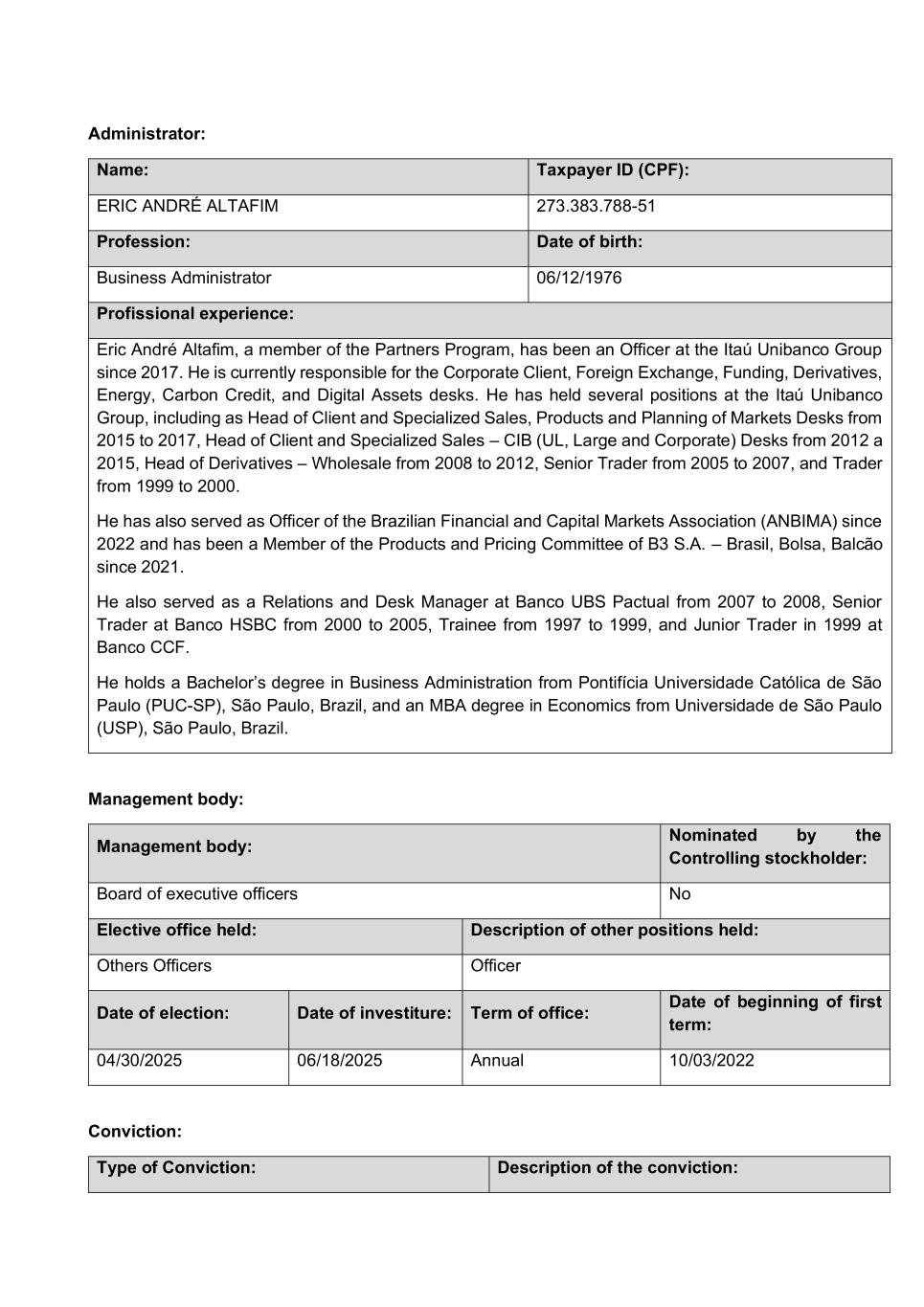 Administrator: Name: Taxpayer ID (CPF): ERIC ANDRÉ ALTAFIM 273.383.788-51 Profession: Date of birth: Business Administrator 06/12/1976 Profissional experience: Eric André Altafim, a member of the Partners Program, has been an Officer at the Itaú Unibanco Group since 2017. He is currently responsible for the Corporate Client, Foreign Exchange, Funding, Derivatives, Energy, Carbon Credit, and Digital Assets desks. He has held several positions at the Itaú Unibanco Group, including as Head of Client and Specialized Sales, Products and Planning of Markets Desks from 2015 to 2017, Head of Client and Specialized Sales – CIB (UL, Large and Corporate) Desks from 2012 a 2015, Head of Derivatives – Wholesale from 2008 to 2012, Senior Trader from 2005 to 2007, and Trader from 1999 to 2000. He has also served as Officer of the Brazilian Financial and Capital Markets Association (ANBIMA) since 2022 and has been a Member of the Products and Pricing Committee of B3 S.A. – Brasil, Bolsa, Balcão since 2021. He also served as a Relations and Desk Manager at Banco UBS Pactual from 2007 to 2008, Senior Trader at Banco HSBC from 2000 to 2005, Trainee from 1997 to 1999, and Junior Trader in 1999 at Banco CCF. He holds a Bachelor’s degree in Business Administration from Pontifícia Universidade Católica de São Paulo (PUC-SP), São Paulo, Brazil, and an MBA degree in Economics from Universidade de São Paulo (USP), São Paulo, Brazil. Management body: Management body: Nominated by the Controlling stockholder: Board of executive officers No Elective office held: Description of other positions held: Others Officers Officer Date of election: Date of investiture: Term of office: Date of beginning of first term: 04/30/2025 06/18/2025 Annual 10/03/2022 Conviction: Type of Conviction: Description of the conviction: