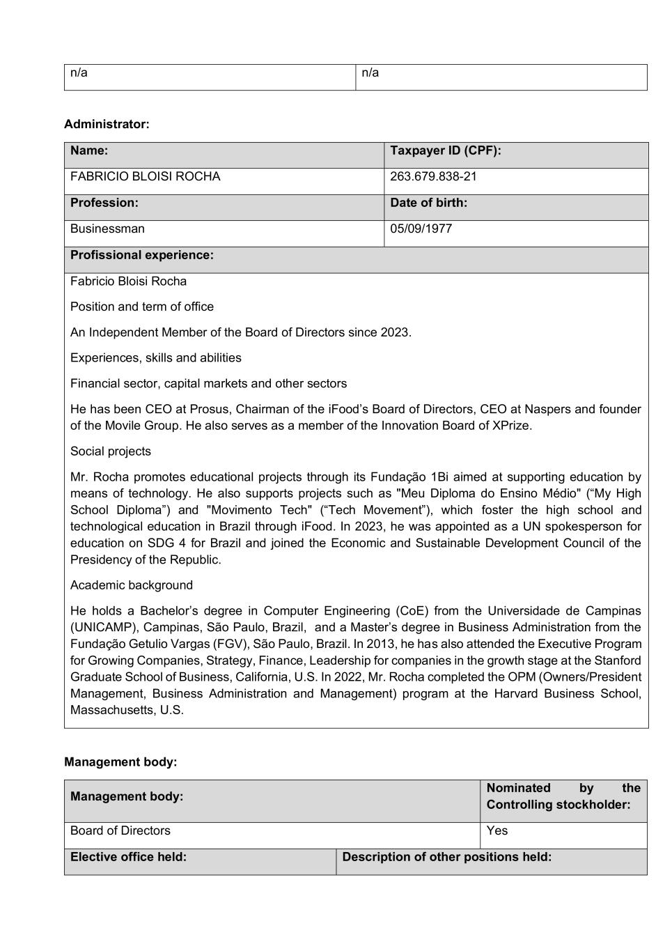 n/a n/a Administrator: Name: Taxpayer ID (CPF): FABRICIO BLOISI ROCHA 263.679.838-21 Profession: Date of birth: Businessman 05/09/1977 Profissional experience: Fabricio Bloisi Rocha Position and term of office An Independent Member of the Board of Directors since 2023. Experiences, skills and abilities Financial sector, capital markets and other sectors He has been CEO at Prosus, Chairman of the iFood’s Board of Directors, CEO at Naspers and founder of the Movile Group. He also serves as a member of the Innovation Board of XPrize. Social projects Mr. Rocha promotes educational projects through its Fundação 1Bi aimed at supporting education by means of technology. He also supports projects such as "Meu Diploma do Ensino Médio" (“My High School Diploma”) and "Movimento Tech" (“Tech Movement”), which foster the high school and technological education in Brazil through iFood. In 2023, he was appointed as a UN spokesperson for education on SDG 4 for Brazil and joined the Economic and Sustainable Development Council of the Presidency of the Republic. Academic background He holds a Bachelor’s degree in Computer Engineering (CoE) from the Universidade de Campinas (UNICAMP), Campinas, São Paulo, Brazil, and a Master’s degree in Business Administration from the Fundação Getulio Vargas (FGV), São Paulo, Brazil. In 2013, he has also attended the Executive Program for Growing Companies, Strategy, Finance, Leadership for companies in the growth stage at the Stanford Graduate School of Business, California, U.S. In 2022, Mr. Rocha completed the OPM (Owners/President Management, Business Administration and Management) program at the Harvard Business School, Massachusetts, U.S. Management body: Management body: Nominated by the Controlling stockholder: Board of Directors Yes Elective office held: Description of other positions held: