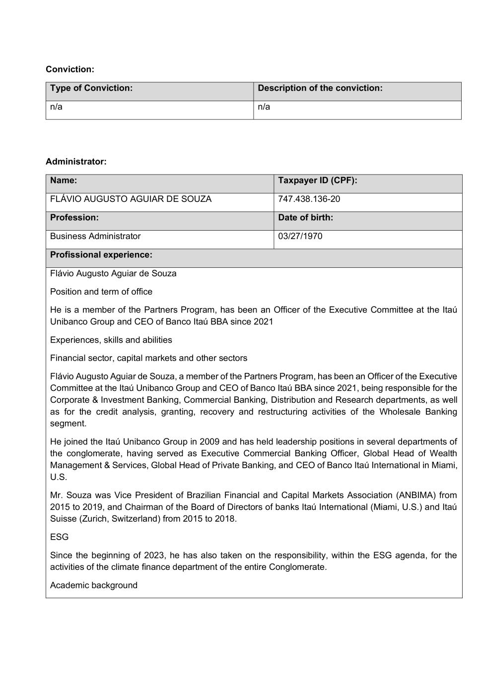 Conviction: Type of Conviction: Description of the conviction: n/a n/a Administrator: Name: Taxpayer ID (CPF): FLÁVIO AUGUSTO AGUIAR DE SOUZA 747.438.136-20 Profession: Date of birth: Business Administrator 03/27/1970 Profissional experience: Flávio Augusto Aguiar de Souza Position and term of office He is a member of the Partners Program, has been an Officer of the Executive Committee at the Itaú Unibanco Group and CEO of Banco Itaú BBA since 2021 Experiences, skills and abilities Financial sector, capital markets and other sectors Flávio Augusto Aguiar de Souza, a member of the Partners Program, has been an Officer of the Executive Committee at the Itaú Unibanco Group and CEO of Banco Itaú BBA since 2021, being responsible for the Corporate & Investment Banking, Commercial Banking, Distribution and Research departments, as well as for the credit analysis, granting, recovery and restructuring activities of the Wholesale Banking segment. He joined the Itaú Unibanco Group in 2009 and has held leadership positions in several departments of the conglomerate, having served as Executive Commercial Banking Officer, Global Head of Wealth Management & Services, Global Head of Private Banking, and CEO of Banco Itaú International in Miami, U.S. Mr. Souza was Vice President of Brazilian Financial and Capital Markets Association (ANBIMA) from 2015 to 2019, and Chairman of the Board of Directors of banks Itaú International (Miami, U.S.) and Itaú Suisse (Zurich, Switzerland) from 2015 to 2018. ESG Since the beginning of 2023, he has also taken on the responsibility, within the ESG agenda, for the activities of the climate finance department of the entire Conglomerate. Academic background