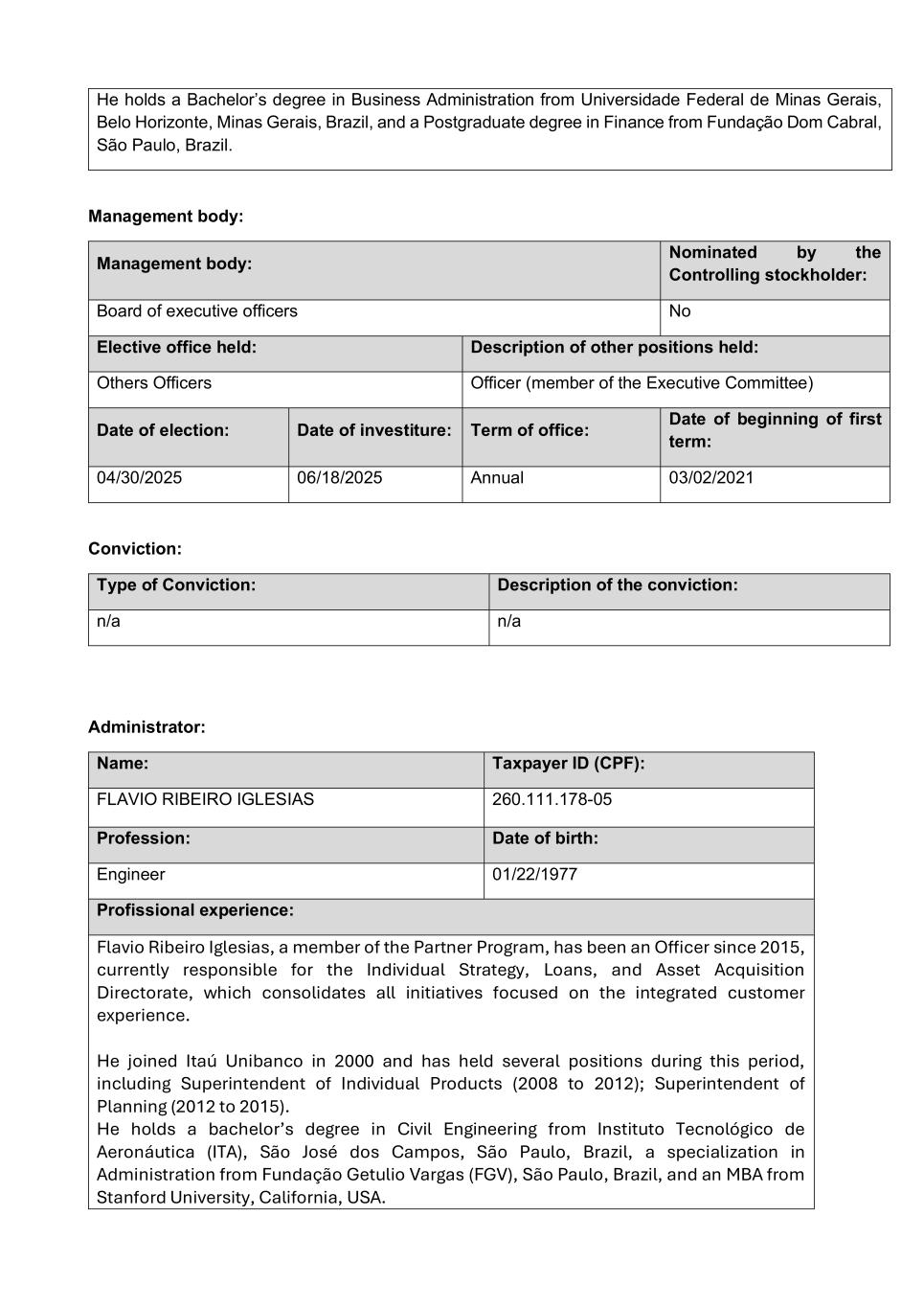 He holds a Bachelor’s degree in Business Administration from Universidade Federal de Minas Gerais, Belo Horizonte, Minas Gerais, Brazil, and a Postgraduate degree in Finance from Fundação Dom Cabral, São Paulo, Brazil. Management body: Management body: Nominated by the Controlling stockholder: Board of executive officers No Elective office held: Description of other positions held: Others Officers Officer (member of the Executive Committee) Date of election: Date of investiture: Term of office: Date of beginning of first term: 04/30/2025 06/18/2025 Annual 03/02/2021 Conviction: Type of Conviction: Description of the conviction: n/a n/a Administrator: Name: Taxpayer ID (CPF): FLAVIO RIBEIRO IGLESIAS 260.111.178-05 Profession: Date of birth: Engineer 01/22/1977 Profissional experience: Flavio Ribeiro Iglesias, a member of the Partner Program, has been an Officer since 2015, currently responsible for the Individual Strategy, Loans, and Asset Acquisition Directorate, which consolidates all initiatives focused on the integrated customer experience. He joined Itaú Unibanco in 2000 and has held several positions during this period, including Superintendent of Individual Products (2008 to 2012); Superintendent of Planning (2012 to 2015). He holds a bachelor’s degree in Civil Engineering from Instituto Tecnológico de Aeronáutica (ITA), São José dos Campos, São Paulo, Brazil, a specialization in Administration from Fundação Getulio Vargas (FGV), São Paulo, Brazil, and an MBA from Stanford University, California, USA.