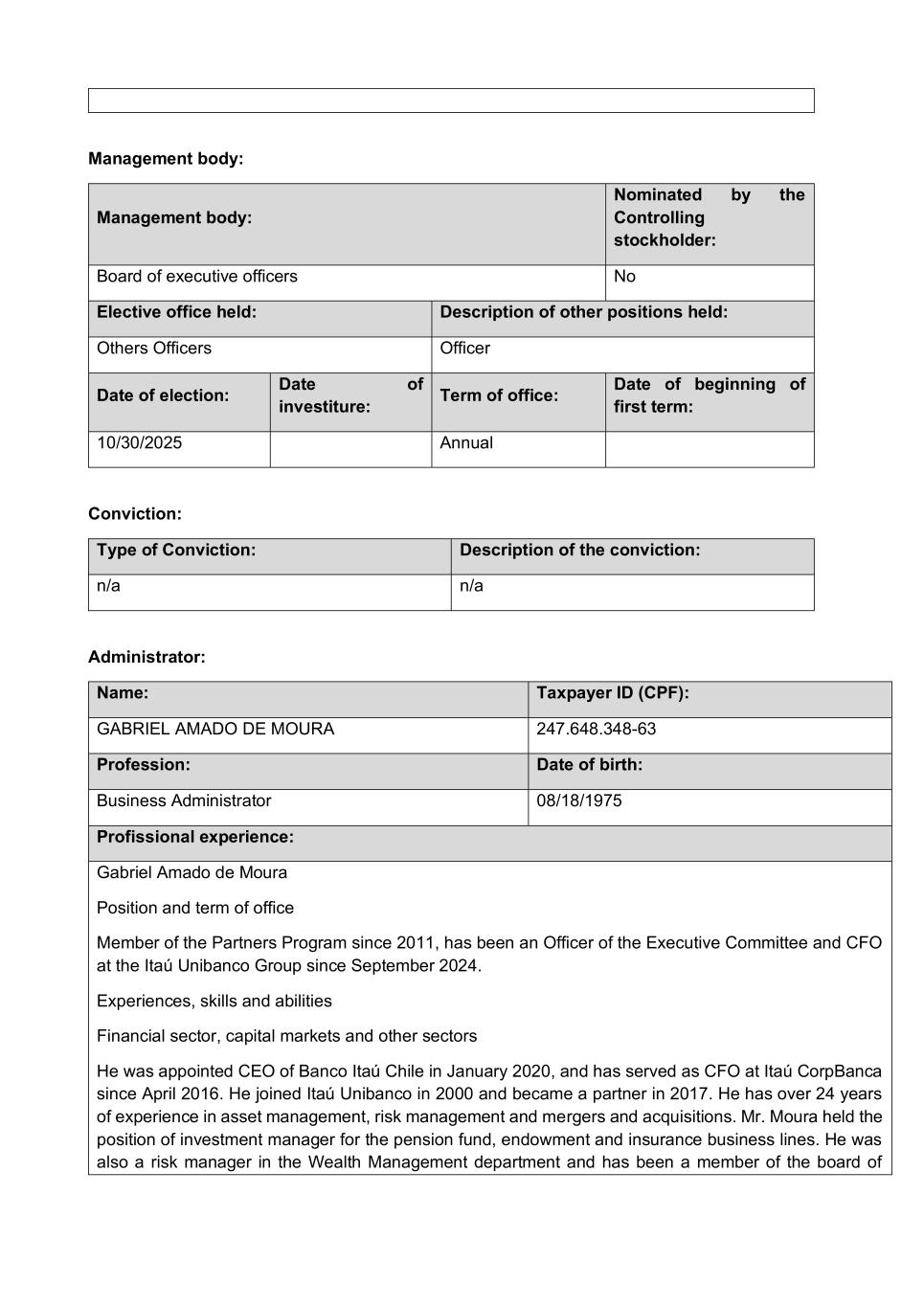 Management body: Management body: Nominated by the Controlling stockholder: Board of executive officers No Elective office held: Description of other positions held: Others Officers Officer Date of election: Date of investiture: Term of office: Date of beginning of first term: 10/30/2025 Annual Conviction: Type of Conviction: Description of the conviction: n/a n/a Administrator: Name: Taxpayer ID (CPF): GABRIEL AMADO DE MOURA 247.648.348-63 Profession: Date of birth: Business Administrator 08/18/1975 Profissional experience: Gabriel Amado de Moura Position and term of office Member of the Partners Program since 2011, has been an Officer of the Executive Committee and CFO at the Itaú Unibanco Group since September 2024. Experiences, skills and abilities Financial sector, capital markets and other sectors He was appointed CEO of Banco Itaú Chile in January 2020, and has served as CFO at Itaú CorpBanca since April 2016. He joined Itaú Unibanco in 2000 and became a partner in 2017. He has over 24 years of experience in asset management, risk management and mergers and acquisitions. Mr. Moura held the position of investment manager for the pension fund, endowment and insurance business lines. He was also a risk manager in the Wealth Management department and has been a member of the board of