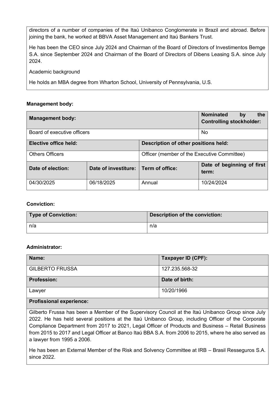 directors of a number of companies of the Itaú Unibanco Conglomerate in Brazil and abroad. Before joining the bank, he worked at BBVA Asset Management and Itaú Bankers Trust. He has been the CEO since July 2024 and Chairman of the Board of Directors of Investimentos Bemge S.A. since September 2024 and Chairman of the Board of Directors of Dibens Leasing S.A. since July 2024. Academic background He holds an MBA degree from Wharton School, University of Pennsylvania, U.S. Management body: Management body: Nominated by the Controlling stockholder: Board of executive officers No Elective office held: Description of other positions held: Others Officers Officer (member of the Executive Committee) Date of election: Date of investiture: Term of office: Date of beginning of first term: 04/30/2025 06/18/2025 Annual 10/24/2024 Conviction: Type of Conviction: Description of the conviction: n/a n/a Administrator: Name: Taxpayer ID (CPF): GILBERTO FRUSSA 127.235.568-32 Profession: Date of birth: Lawyer 10/20/1966 Profissional experience: Gilberto Frussa has been a Member of the Supervisory Council at the Itaú Unibanco Group since July 2022. He has held several positions at the Itaú Unibanco Group, including Officer of the Corporate Compliance Department from 2017 to 2021, Legal Officer of Products and Business – Retail Business from 2015 to 2017 and Legal Officer at Banco Itaú BBA S.A. from 2006 to 2015, where he also served as a lawyer from 1995 a 2006. He has been an External Member of the Risk and Solvency Committee at IRB – Brasil Resseguros S.A. since 2022.