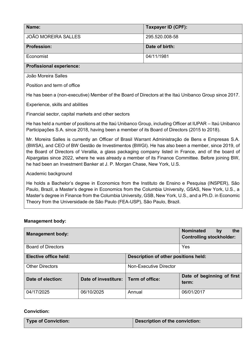 Name: Taxpayer ID (CPF): JOÃO MOREIRA SALLES 295.520.008-58 Profession: Date of birth: Economist 04/11/1981 Profissional experience: João Moreira Salles Position and term of office He has been a (non-executive) Member of the Board of Directors at the Itaú Unibanco Group since 2017. Experience, skills and abilities Financial sector, capital markets and other sectors He has held a number of positions at the Itaú Unibanco Group, including Officer at IUPAR – Itaú Unibanco Participações S.A. since 2018, having been a member of its Board of Directors (2015 to 2018). Mr. Moreira Salles is currently an Officer of Brasil Warrant Administração de Bens e Empresas S.A. (BWSA), and CEO of BW Gestão de Investimentos (BWGI). He has also been a member, since 2019, of the Board of Directors of Verallia, a glass packaging company listed in France, and of the board of Alpargatas since 2022, where he was already a member of its Finance Committee. Before joining BW, he had been an Investment Banker at J. P. Morgan Chase, New York, U.S. Academic background He holds a Bachelor’s degree in Economics from the Instituto de Ensino e Pesquisa (INSPER), São Paulo, Brazil, a Master’s degree in Economics from the Columbia University, GSAS, New York, U.S., a Master’s degree in Finance from the Columbia University, GSB, New York, U.S., and a Ph.D. in Economic Theory from the Universidade de São Paulo (FEA-USP), São Paulo, Brazil. Management body: Management body: Nominated by the Controlling stockholder: Board of Directors Yes Elective office held: Description of other positions held: Other Directors Non-Executive Director Date of election: Date of investiture: Term of office: Date of beginning of first term: 04/17/2025 06/10/2025 Annual 06/01/2017 Conviction: Type of Conviction: Description of the conviction: