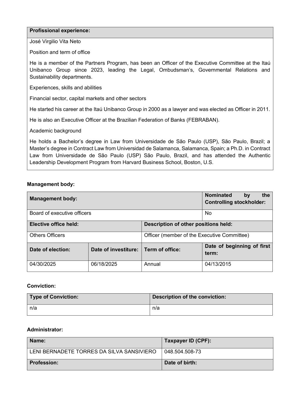 Profissional experience: José Virgilio Vita Neto Position and term of office He is a member of the Partners Program, has been an Officer of the Executive Committee at the Itaú Unibanco Group since 2023, leading the Legal, Ombudsman’s, Governmental Relations and Sustainability departments. Experiences, skills and abilities Financial sector, capital markets and other sectors He started his career at the Itaú Unibanco Group in 2000 as a lawyer and was elected as Officer in 2011. He is also an Executive Officer at the Brazilian Federation of Banks (FEBRABAN). Academic background He holds a Bachelor’s degree in Law from Universidade de São Paulo (USP), São Paulo, Brazil; a Master’s degree in Contract Law from Universidad de Salamanca, Salamanca, Spain; a Ph.D. in Contract Law from Universidade de São Paulo (USP) São Paulo, Brazil, and has attended the Authentic Leadership Development Program from Harvard Business School, Boston, U.S. Management body: Management body: Nominated by the Controlling stockholder: Board of executive officers No Elective office held: Description of other positions held: Others Officers Officer (member of the Executive Committee) Date of election: Date of investiture: Term of office: Date of beginning of first term: 04/30/2025 06/18/2025 Annual 04/13/2015 Conviction: Type of Conviction: Description of the conviction: n/a n/a Administrator: Name: Taxpayer ID (CPF): LENI BERNADETE TORRES DA SILVA SANSIVIERO 048.504.508-73 Profession: Date of birth: