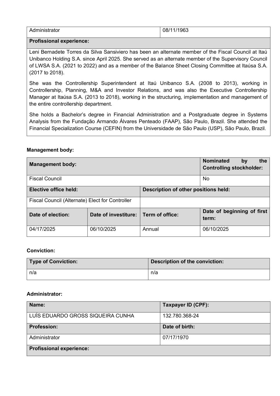 Administrator 08/11/1963 Profissional experience: Leni Bernadete Torres da Silva Sansiviero has been an alternate member of the Fiscal Council at Itaú Unibanco Holding S.A. since April 2025. She served as an alternate member of the Supervisory Council of LWSA S.A. (2021 to 2022) and as a member of the Balance Sheet Closing Committee at Itaúsa S.A. (2017 to 2018). She was the Controllership Superintendent at Itaú Unibanco S.A. (2008 to 2013), working in Controllership, Planning, M&A and Investor Relations, and was also the Executive Controllership Manager at Itaúsa S.A. (2013 to 2018), working in the structuring, implementation and management of the entire controllership department. She holds a Bachelor’s degree in Financial Administration and a Postgraduate degree in Systems Analysis from the Fundação Armando Álvares Penteado (FAAP), São Paulo, Brazil. She attended the Financial Specialization Course (CEFIN) from the Universidade de São Paulo (USP), São Paulo, Brazil. Management body: Management body: Nominated by the Controlling stockholder: Fiscal Council No Elective office held: Description of other positions held: Fiscal Council (Alternate) Elect for Controller Date of election: Date of investiture: Term of office: Date of beginning of first term: 04/17/2025 06/10/2025 Annual 06/10/2025 Conviction: Type of Conviction: Description of the conviction: n/a n/a Administrator: Name: Taxpayer ID (CPF): LUÍS EDUARDO GROSS SIQUEIRA CUNHA 132.780.368-24 Profession: Date of birth: Administrator 07/17/1970 Profissional experience: