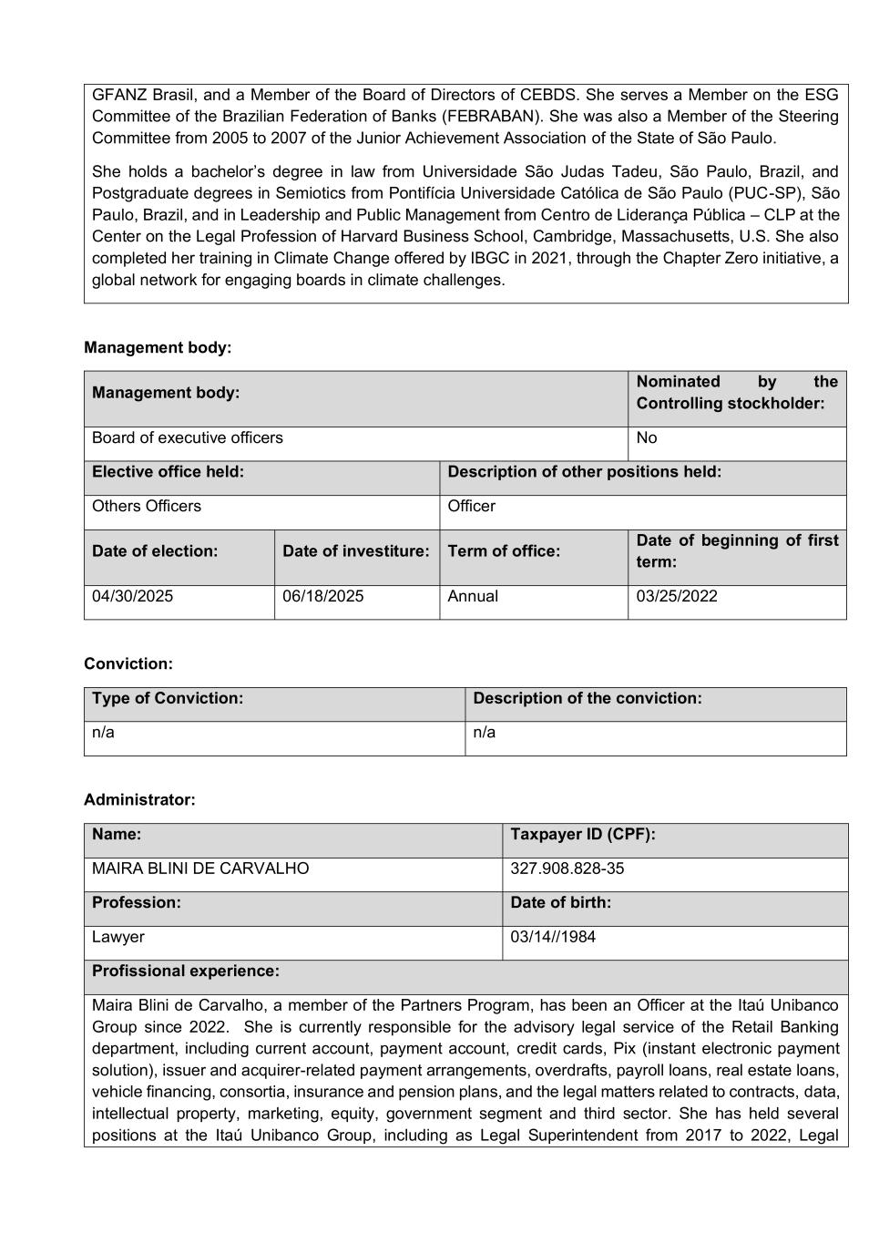 GFANZ Brasil, and a Member of the Board of Directors of CEBDS. She serves a Member on the ESG Committee of the Brazilian Federation of Banks (FEBRABAN). She was also a Member of the Steering Committee from 2005 to 2007 of the Junior Achievement Association of the State of São Paulo. She holds a bachelor’s degree in law from Universidade São Judas Tadeu, São Paulo, Brazil, and Postgraduate degrees in Semiotics from Pontifícia Universidade Católica de São Paulo (PUC-SP), São Paulo, Brazil, and in Leadership and Public Management from Centro de Liderança Pública – CLP at the Center on the Legal Profession of Harvard Business School, Cambridge, Massachusetts, U.S. She also completed her training in Climate Change offered by IBGC in 2021, through the Chapter Zero initiative, a global network for engaging boards in climate challenges. Management body: Management body: Nominated by the Controlling stockholder: Board of executive officers No Elective office held: Description of other positions held: Others Officers Officer Date of election: Date of investiture: Term of office: Date of beginning of first term: 04/30/2025 06/18/2025 Annual 03/25/2022 Conviction: Type of Conviction: Description of the conviction: n/a n/a Administrator: Name: Taxpayer ID (CPF): MAIRA BLINI DE CARVALHO 327.908.828-35 Profession: Date of birth: Lawyer 03/14//1984 Profissional experience: Maira Blini de Carvalho, a member of the Partners Program, has been an Officer at the Itaú Unibanco Group since 2022. She is currently responsible for the advisory legal service of the Retail Banking department, including current account, payment account, credit cards, Pix (instant electronic payment solution), issuer and acquirer-related payment arrangements, overdrafts, payroll loans, real estate loans, vehicle financing, consortia, insurance and pension plans, and the legal matters related to contracts, data, intellectual property, marketing, equity, government segment and third sector. She has held several positions at the Itaú Unibanco Group, including as Legal Superintendent from 2017 to 2022, Legal