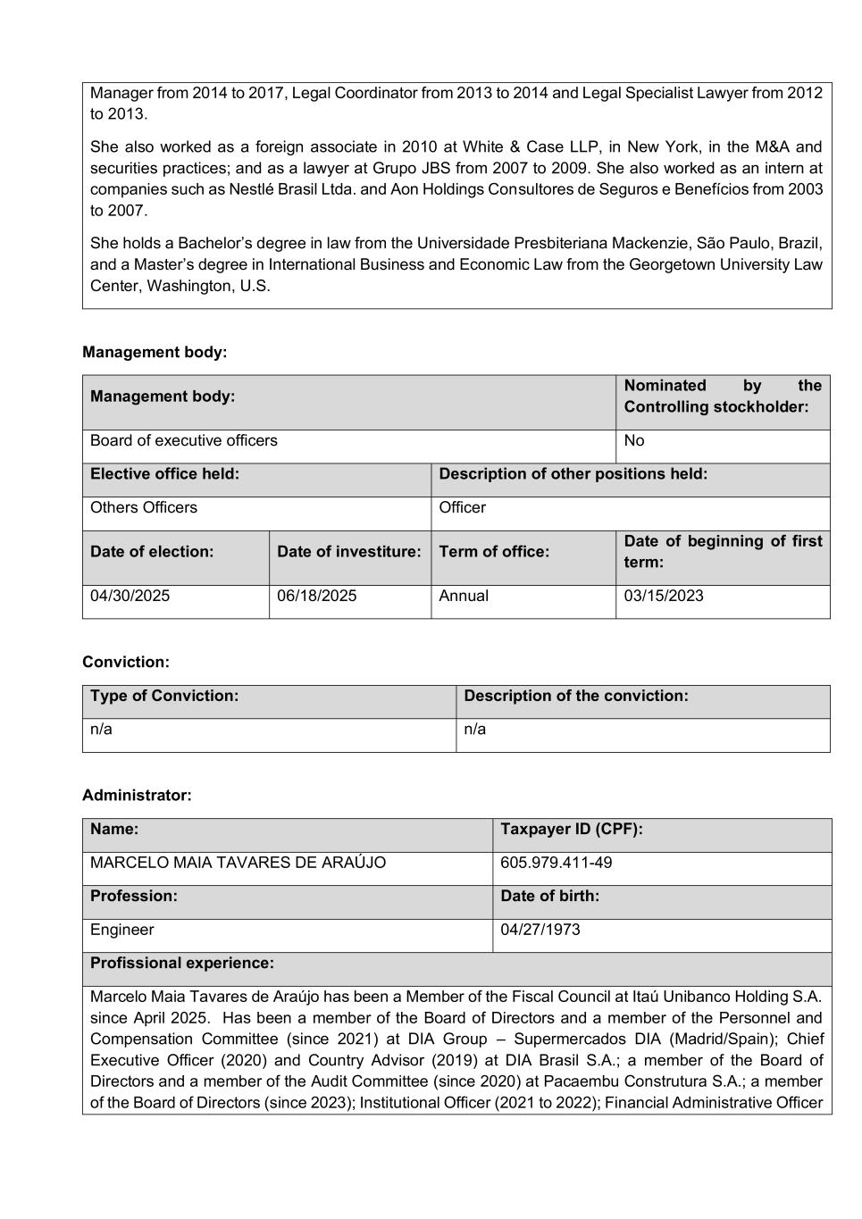 Manager from 2014 to 2017, Legal Coordinator from 2013 to 2014 and Legal Specialist Lawyer from 2012 to 2013. She also worked as a foreign associate in 2010 at White & Case LLP, in New York, in the M&A and securities practices; and as a lawyer at Grupo JBS from 2007 to 2009. She also worked as an intern at companies such as Nestlé Brasil Ltda. and Aon Holdings Consultores de Seguros e Benefícios from 2003 to 2007. She holds a Bachelor’s degree in law from the Universidade Presbiteriana Mackenzie, São Paulo, Brazil, and a Master’s degree in International Business and Economic Law from the Georgetown University Law Center, Washington, U.S. Management body: Management body: Nominated by the Controlling stockholder: Board of executive officers No Elective office held: Description of other positions held: Others Officers Officer Date of election: Date of investiture: Term of office: Date of beginning of first term: 04/30/2025 06/18/2025 Annual 03/15/2023 Conviction: Type of Conviction: Description of the conviction: n/a n/a Administrator: Name: Taxpayer ID (CPF): MARCELO MAIA TAVARES DE ARAÚJO 605.979.411-49 Profession: Date of birth: Engineer 04/27/1973 Profissional experience: Marcelo Maia Tavares de Araújo has been a Member of the Fiscal Council at Itaú Unibanco Holding S.A. since April 2025. Has been a member of the Board of Directors and a member of the Personnel and Compensation Committee (since 2021) at DIA Group – Supermercados DIA (Madrid/Spain); Chief Executive Officer (2020) and Country Advisor (2019) at DIA Brasil S.A.; a member of the Board of Directors and a member of the Audit Committee (since 2020) at Pacaembu Construtura S.A.; a member of the Board of Directors (since 2023); Institutional Officer (2021 to 2022); Financial Administrative Officer