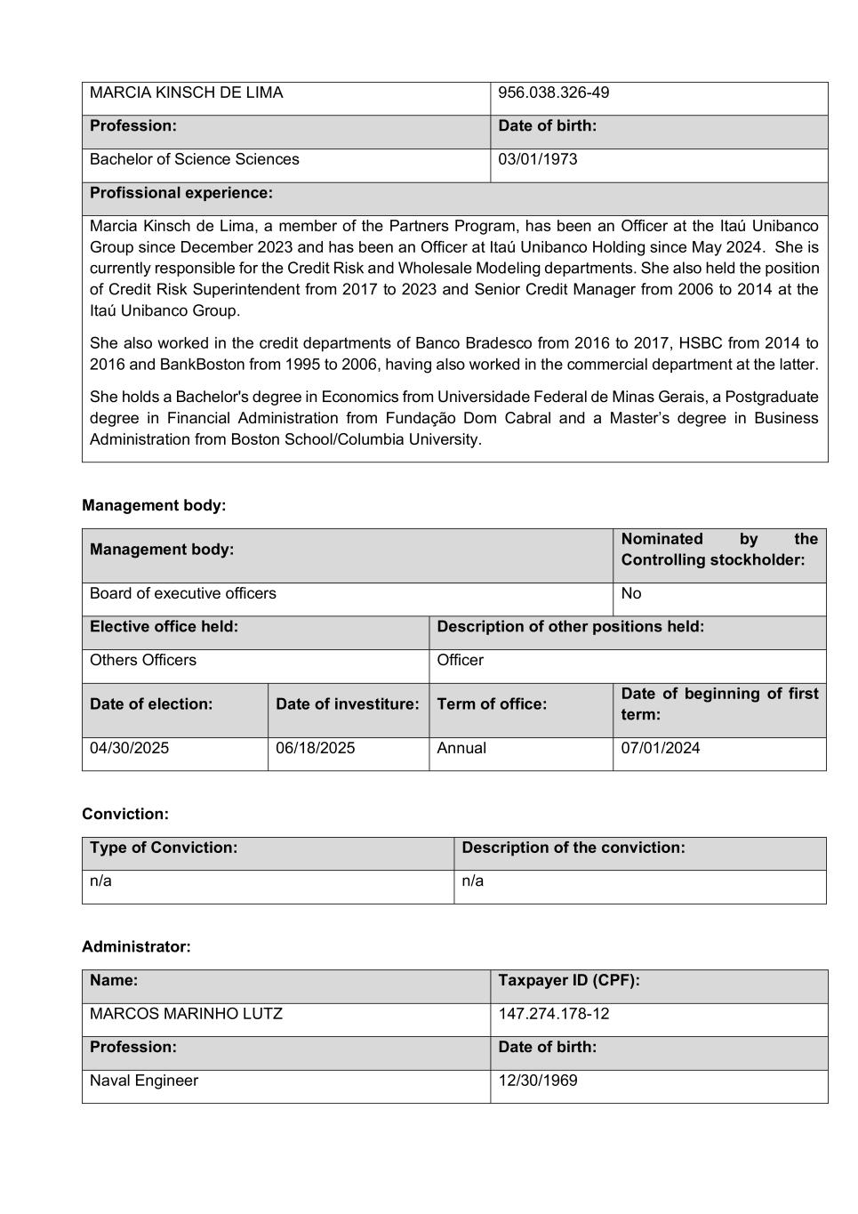 MARCIA KINSCH DE LIMA 956.038.326-49 Profession: Date of birth: Bachelor of Science Sciences 03/01/1973 Profissional experience: Marcia Kinsch de Lima, a member of the Partners Program, has been an Officer at the Itaú Unibanco Group since December 2023 and has been an Officer at Itaú Unibanco Holding since May 2024. She is currently responsible for the Credit Risk and Wholesale Modeling departments. She also held the position of Credit Risk Superintendent from 2017 to 2023 and Senior Credit Manager from 2006 to 2014 at the Itaú Unibanco Group. She also worked in the credit departments of Banco Bradesco from 2016 to 2017, HSBC from 2014 to 2016 and BankBoston from 1995 to 2006, having also worked in the commercial department at the latter. She holds a Bachelor's degree in Economics from Universidade Federal de Minas Gerais, a Postgraduate degree in Financial Administration from Fundação Dom Cabral and a Master’s degree in Business Administration from Boston School/Columbia University. Management body: Management body: Nominated by the Controlling stockholder: Board of executive officers No Elective office held: Description of other positions held: Others Officers Officer Date of election: Date of investiture: Term of office: Date of beginning of first term: 04/30/2025 06/18/2025 Annual 07/01/2024 Conviction: Type of Conviction: Description of the conviction: n/a n/a Administrator: Name: Taxpayer ID (CPF): MARCOS MARINHO LUTZ 147.274.178-12 Profession: Date of birth: Naval Engineer 12/30/1969