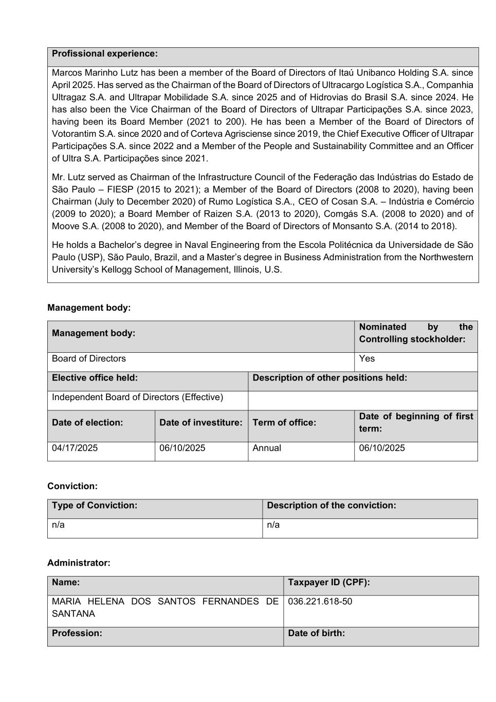 Profissional experience: Marcos Marinho Lutz has been a member of the Board of Directors of Itaú Unibanco Holding S.A. since April 2025. Has served as the Chairman of the Board of Directors of Ultracargo Logística S.A., Companhia Ultragaz S.A. and Ultrapar Mobilidade S.A. since 2025 and of Hidrovias do Brasil S.A. since 2024. He has also been the Vice Chairman of the Board of Directors of Ultrapar Participações S.A. since 2023, having been its Board Member (2021 to 200). He has been a Member of the Board of Directors of Votorantim S.A. since 2020 and of Corteva Agrisciense since 2019, the Chief Executive Officer of Ultrapar Participações S.A. since 2022 and a Member of the People and Sustainability Committee and an Officer of Ultra S.A. Participações since 2021. Mr. Lutz served as Chairman of the Infrastructure Council of the Federação das Indústrias do Estado de São Paulo – FIESP (2015 to 2021); a Member of the Board of Directors (2008 to 2020), having been Chairman (July to December 2020) of Rumo Logística S.A., CEO of Cosan S.A. – Indústria e Comércio (2009 to 2020); a Board Member of Raizen S.A. (2013 to 2020), Comgás S.A. (2008 to 2020) and of Moove S.A. (2008 to 2020), and Member of the Board of Directors of Monsanto S.A. (2014 to 2018). He holds a Bachelor’s degree in Naval Engineering from the Escola Politécnica da Universidade de São Paulo (USP), São Paulo, Brazil, and a Master’s degree in Business Administration from the Northwestern University’s Kellogg School of Management, Illinois, U.S. Management body: Management body: Nominated by the Controlling stockholder: Board of Directors Yes Elective office held: Description of other positions held: Independent Board of Directors (Effective) Date of election: Date of investiture: Term of office: Date of beginning of first term: 04/17/2025 06/10/2025 Annual 06/10/2025 Conviction: Type of Conviction: Description of the conviction: n/a n/a Administrator: Name: Taxpayer ID (CPF): MARIA HELENA DOS SANTOS FERNANDES DE SANTANA 036.221.618-50 Profession: Date of birth: