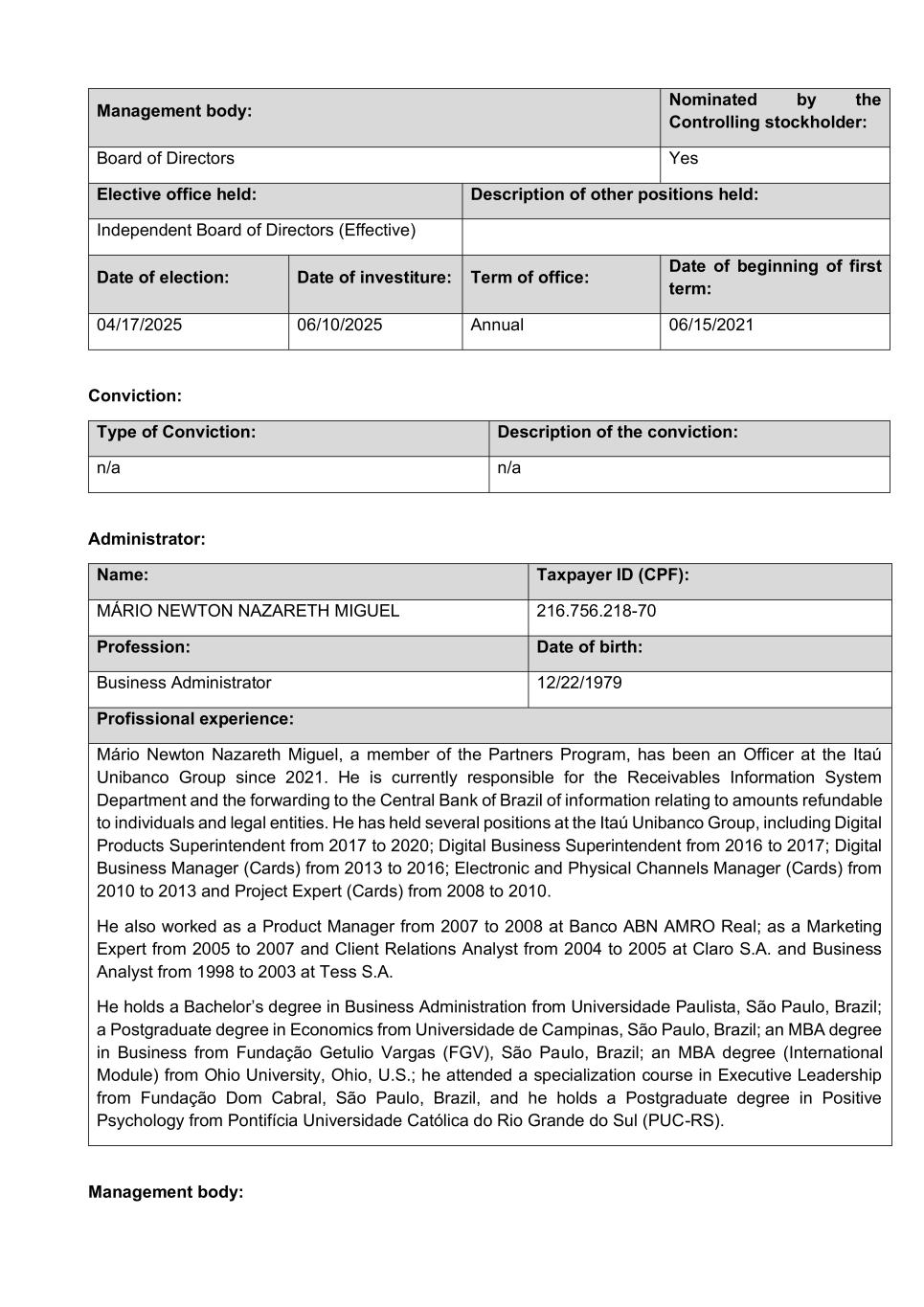 Management body: Nominated by the Controlling stockholder: Board of Directors Yes Elective office held: Description of other positions held: Independent Board of Directors (Effective) Date of election: Date of investiture: Term of office: Date of beginning of first term: 04/17/2025 06/10/2025 Annual 06/15/2021 Conviction: Type of Conviction: Description of the conviction: n/a n/a Administrator: Name: Taxpayer ID (CPF): MÁRIO NEWTON NAZARETH MIGUEL 216.756.218-70 Profession: Date of birth: Business Administrator 12/22/1979 Profissional experience: Mário Newton Nazareth Miguel, a member of the Partners Program, has been an Officer at the Itaú Unibanco Group since 2021. He is currently responsible for the Receivables Information System Department and the forwarding to the Central Bank of Brazil of information relating to amounts refundable to individuals and legal entities. He has held several positions at the Itaú Unibanco Group, including Digital Products Superintendent from 2017 to 2020; Digital Business Superintendent from 2016 to 2017; Digital Business Manager (Cards) from 2013 to 2016; Electronic and Physical Channels Manager (Cards) from 2010 to 2013 and Project Expert (Cards) from 2008 to 2010. He also worked as a Product Manager from 2007 to 2008 at Banco ABN AMRO Real; as a Marketing Expert from 2005 to 2007 and Client Relations Analyst from 2004 to 2005 at Claro S.A. and Business Analyst from 1998 to 2003 at Tess S.A. He holds a Bachelor’s degree in Business Administration from Universidade Paulista, São Paulo, Brazil; a Postgraduate degree in Economics from Universidade de Campinas, São Paulo, Brazil; an MBA degree in Business from Fundação Getulio Vargas (FGV), São Paulo, Brazil; an MBA degree (International Module) from Ohio University, Ohio, U.S.; he attended a specialization course in Executive Leadership from Fundação Dom Cabral, São Paulo, Brazil, and he holds a Postgraduate degree in Positive Psychology from Pontifícia Universidade Católica do Rio Grande do Sul (PUC-RS). Management body:
