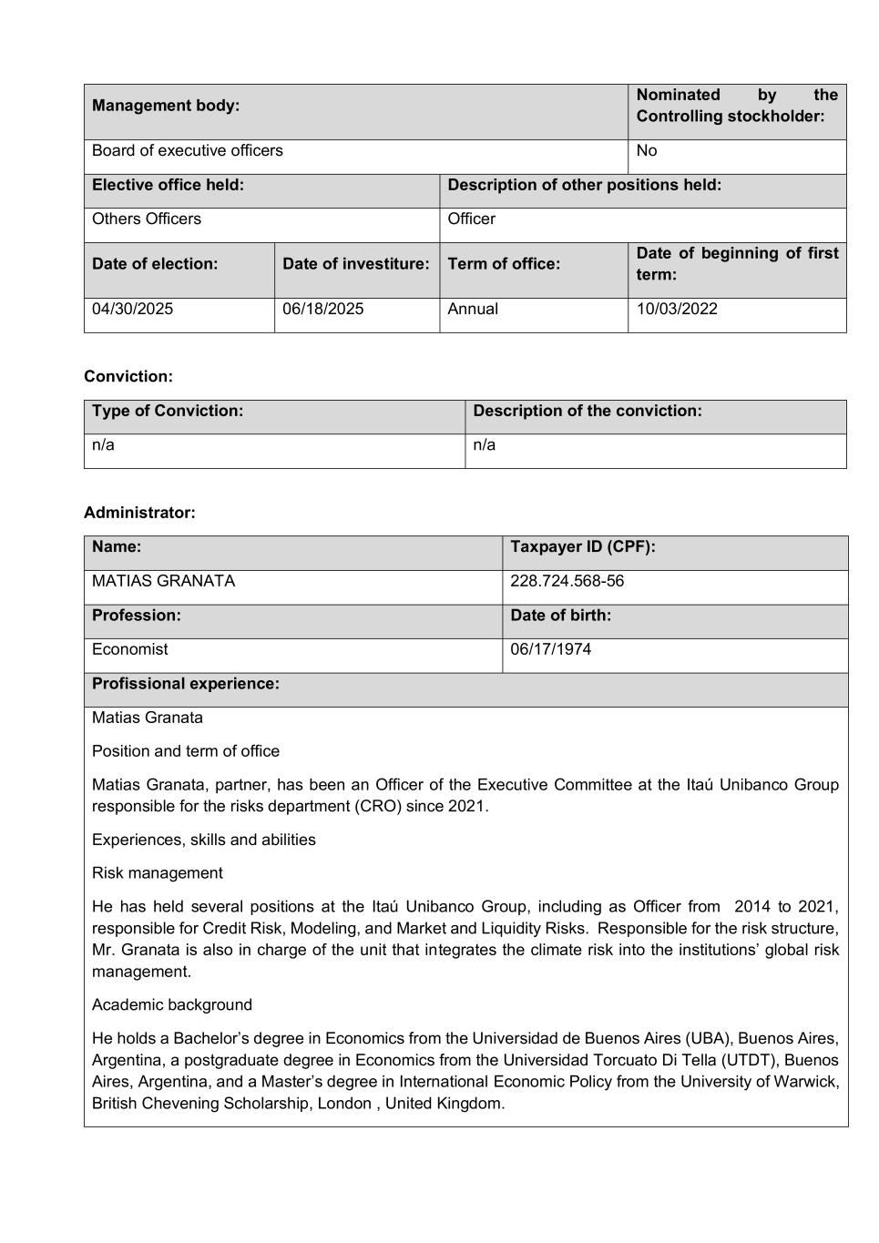 Management body: Nominated by the Controlling stockholder: Board of executive officers No Elective office held: Description of other positions held: Others Officers Officer Date of election: Date of investiture: Term of office: Date of beginning of first term: 04/30/2025 06/18/2025 Annual 10/03/2022 Conviction: Type of Conviction: Description of the conviction: n/a n/a Administrator: Name: Taxpayer ID (CPF): MATIAS GRANATA 228.724.568-56 Profession: Date of birth: Economist 06/17/1974 Profissional experience: Matias Granata Position and term of office Matias Granata, partner, has been an Officer of the Executive Committee at the Itaú Unibanco Group responsible for the risks department (CRO) since 2021. Experiences, skills and abilities Risk management He has held several positions at the Itaú Unibanco Group, including as Officer from 2014 to 2021, responsible for Credit Risk, Modeling, and Market and Liquidity Risks. Responsible for the risk structure, Mr. Granata is also in charge of the unit that integrates the climate risk into the institutions’ global risk management. Academic background He holds a Bachelor’s degree in Economics from the Universidad de Buenos Aires (UBA), Buenos Aires, Argentina, a postgraduate degree in Economics from the Universidad Torcuato Di Tella (UTDT), Buenos Aires, Argentina, and a Master’s degree in International Economic Policy from the University of Warwick, British Chevening Scholarship, London , United Kingdom.