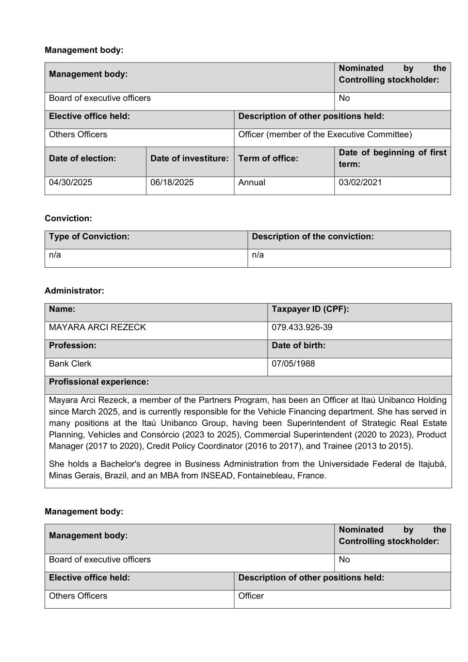 Management body: Management body: Nominated by the Controlling stockholder: Board of executive officers No Elective office held: Description of other positions held: Others Officers Officer (member of the Executive Committee) Date of election: Date of investiture: Term of office: Date of beginning of first term: 04/30/2025 06/18/2025 Annual 03/02/2021 Conviction: Type of Conviction: Description of the conviction: n/a n/a Administrator: Name: Taxpayer ID (CPF): MAYARA ARCI REZECK 079.433.926-39 Profession: Date of birth: Bank Clerk 07/05/1988 Profissional experience: Mayara Arci Rezeck, a member of the Partners Program, has been an Officer at Itaú Unibanco Holding since March 2025, and is currently responsible for the Vehicle Financing department. She has served in many positions at the Itaú Unibanco Group, having been Superintendent of Strategic Real Estate Planning, Vehicles and Consórcio (2023 to 2025), Commercial Superintendent (2020 to 2023), Product Manager (2017 to 2020), Credit Policy Coordinator (2016 to 2017), and Trainee (2013 to 2015). She holds a Bachelor's degree in Business Administration from the Universidade Federal de Itajubá, Minas Gerais, Brazil, and an MBA from INSEAD, Fontainebleau, France. Management body: Management body: Nominated by the Controlling stockholder: Board of executive officers No Elective office held: Description of other positions held: Others Officers Officer
