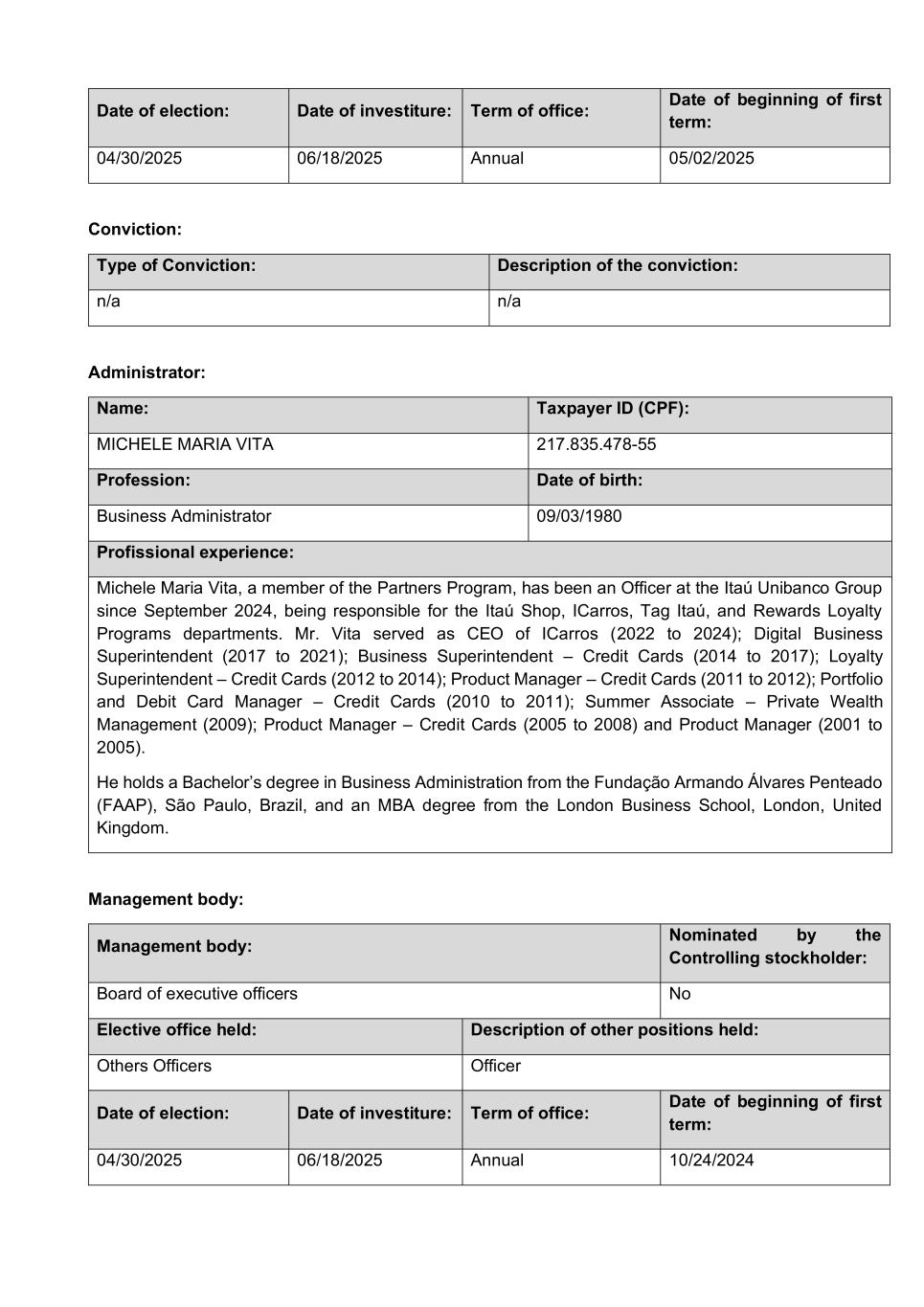 Date of election: Date of investiture: Term of office: Date of beginning of first term: 04/30/2025 06/18/2025 Annual 05/02/2025 Conviction: Type of Conviction: Description of the conviction: n/a n/a Administrator: Name: Taxpayer ID (CPF): MICHELE MARIA VITA 217.835.478-55 Profession: Date of birth: Business Administrator 09/03/1980 Profissional experience: Michele Maria Vita, a member of the Partners Program, has been an Officer at the Itaú Unibanco Group since September 2024, being responsible for the Itaú Shop, ICarros, Tag Itaú, and Rewards Loyalty Programs departments. Mr. Vita served as CEO of ICarros (2022 to 2024); Digital Business Superintendent (2017 to 2021); Business Superintendent – Credit Cards (2014 to 2017); Loyalty Superintendent – Credit Cards (2012 to 2014); Product Manager – Credit Cards (2011 to 2012); Portfolio and Debit Card Manager – Credit Cards (2010 to 2011); Summer Associate – Private Wealth Management (2009); Product Manager – Credit Cards (2005 to 2008) and Product Manager (2001 to 2005). He holds a Bachelor’s degree in Business Administration from the Fundação Armando Álvares Penteado (FAAP), São Paulo, Brazil, and an MBA degree from the London Business School, London, United Kingdom. Management body: Management body: Nominated by the Controlling stockholder: Board of executive officers No Elective office held: Description of other positions held: Others Officers Officer Date of election: Date of investiture: Term of office: Date of beginning of first term: 04/30/2025 06/18/2025 Annual 10/24/2024