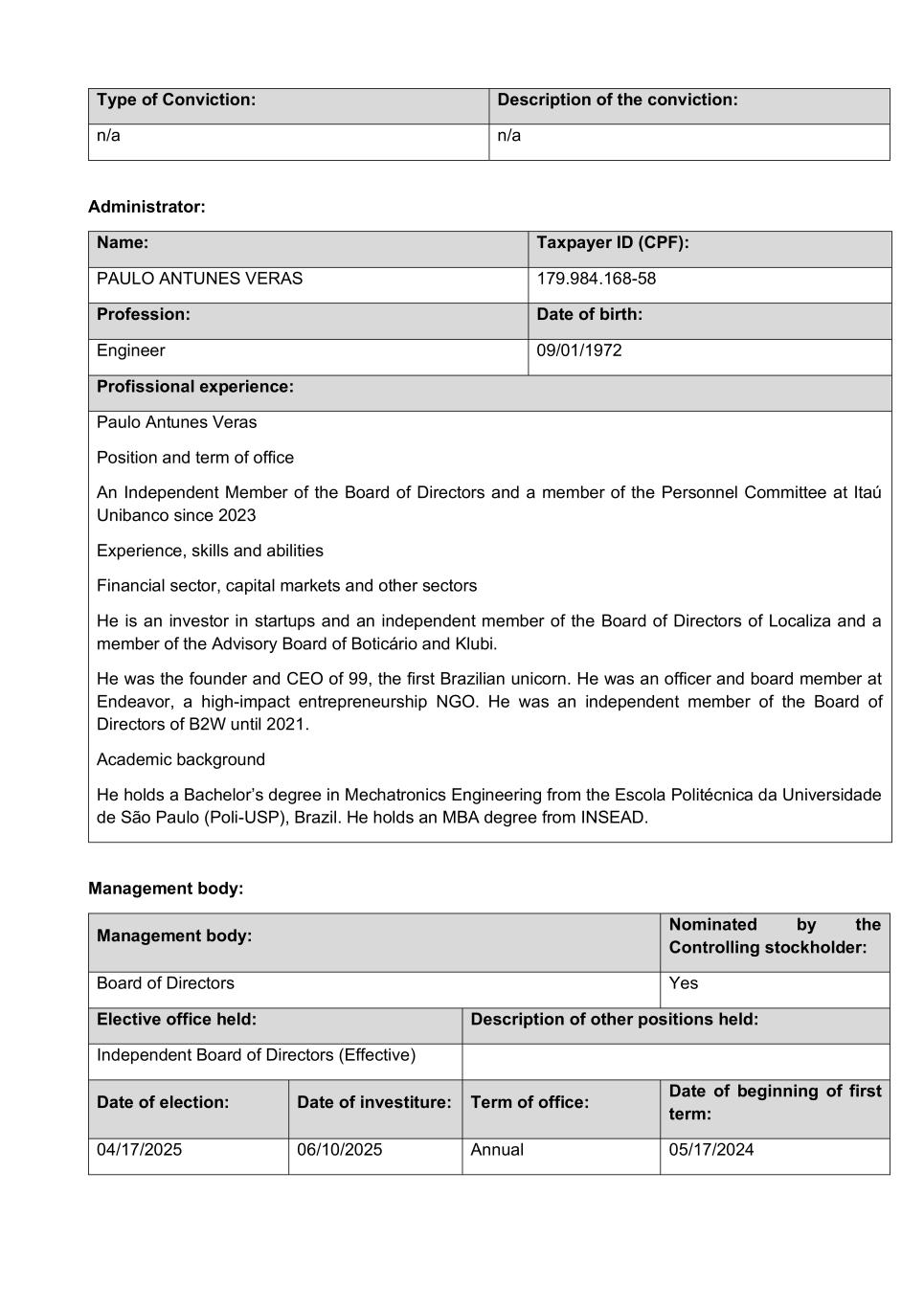 Type of Conviction: Description of the conviction: n/a n/a Administrator: Name: Taxpayer ID (CPF): PAULO ANTUNES VERAS 179.984.168-58 Profession: Date of birth: Engineer 09/01/1972 Profissional experience: Paulo Antunes Veras Position and term of office An Independent Member of the Board of Directors and a member of the Personnel Committee at Itaú Unibanco since 2023 Experience, skills and abilities Financial sector, capital markets and other sectors He is an investor in startups and an independent member of the Board of Directors of Localiza and a member of the Advisory Board of Boticário and Klubi. He was the founder and CEO of 99, the first Brazilian unicorn. He was an officer and board member at Endeavor, a high-impact entrepreneurship NGO. He was an independent member of the Board of Directors of B2W until 2021. Academic background He holds a Bachelor’s degree in Mechatronics Engineering from the Escola Politécnica da Universidade de São Paulo (Poli-USP), Brazil. He holds an MBA degree from INSEAD. Management body: Management body: Nominated by the Controlling stockholder: Board of Directors Yes Elective office held: Description of other positions held: Independent Board of Directors (Effective) Date of election: Date of investiture: Term of office: Date of beginning of first term: 04/17/2025 06/10/2025 Annual 05/17/2024