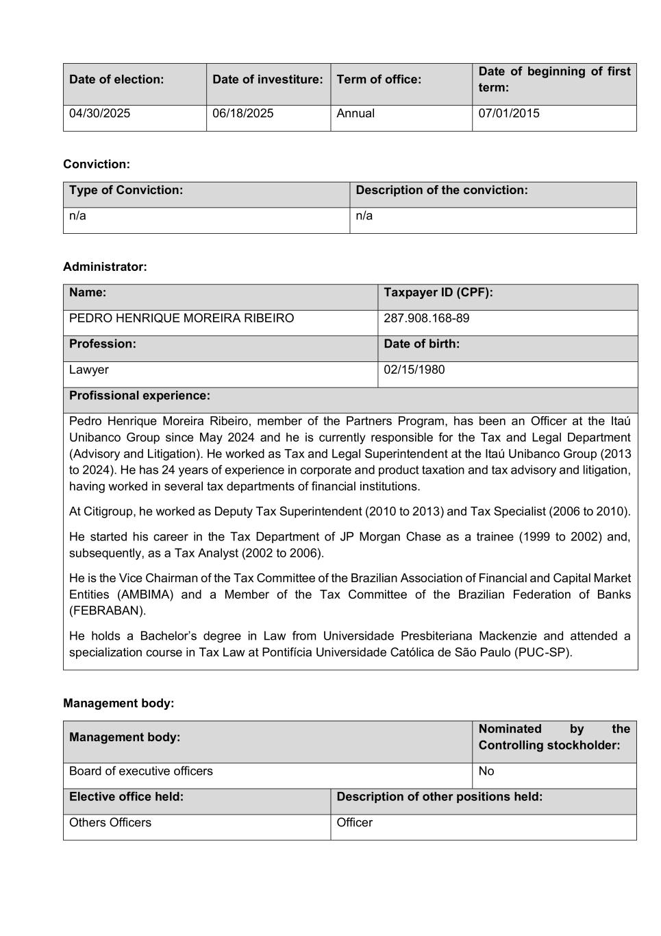 Date of election: Date of investiture: Term of office: Date of beginning of first term: 04/30/2025 06/18/2025 Annual 07/01/2015 Conviction: Type of Conviction: Description of the conviction: n/a n/a Administrator: Name: Taxpayer ID (CPF): PEDRO HENRIQUE MOREIRA RIBEIRO 287.908.168-89 Profession: Date of birth: Lawyer 02/15/1980 Profissional experience: Pedro Henrique Moreira Ribeiro, member of the Partners Program, has been an Officer at the Itaú Unibanco Group since May 2024 and he is currently responsible for the Tax and Legal Department (Advisory and Litigation). He worked as Tax and Legal Superintendent at the Itaú Unibanco Group (2013 to 2024). He has 24 years of experience in corporate and product taxation and tax advisory and litigation, having worked in several tax departments of financial institutions. At Citigroup, he worked as Deputy Tax Superintendent (2010 to 2013) and Tax Specialist (2006 to 2010). He started his career in the Tax Department of JP Morgan Chase as a trainee (1999 to 2002) and, subsequently, as a Tax Analyst (2002 to 2006). He is the Vice Chairman of the Tax Committee of the Brazilian Association of Financial and Capital Market Entities (AMBIMA) and a Member of the Tax Committee of the Brazilian Federation of Banks (FEBRABAN). He holds a Bachelor’s degree in Law from Universidade Presbiteriana Mackenzie and attended a specialization course in Tax Law at Pontifícia Universidade Católica de São Paulo (PUC-SP). Management body: Management body: Nominated by the Controlling stockholder: Board of executive officers No Elective office held: Description of other positions held: Others Officers Officer