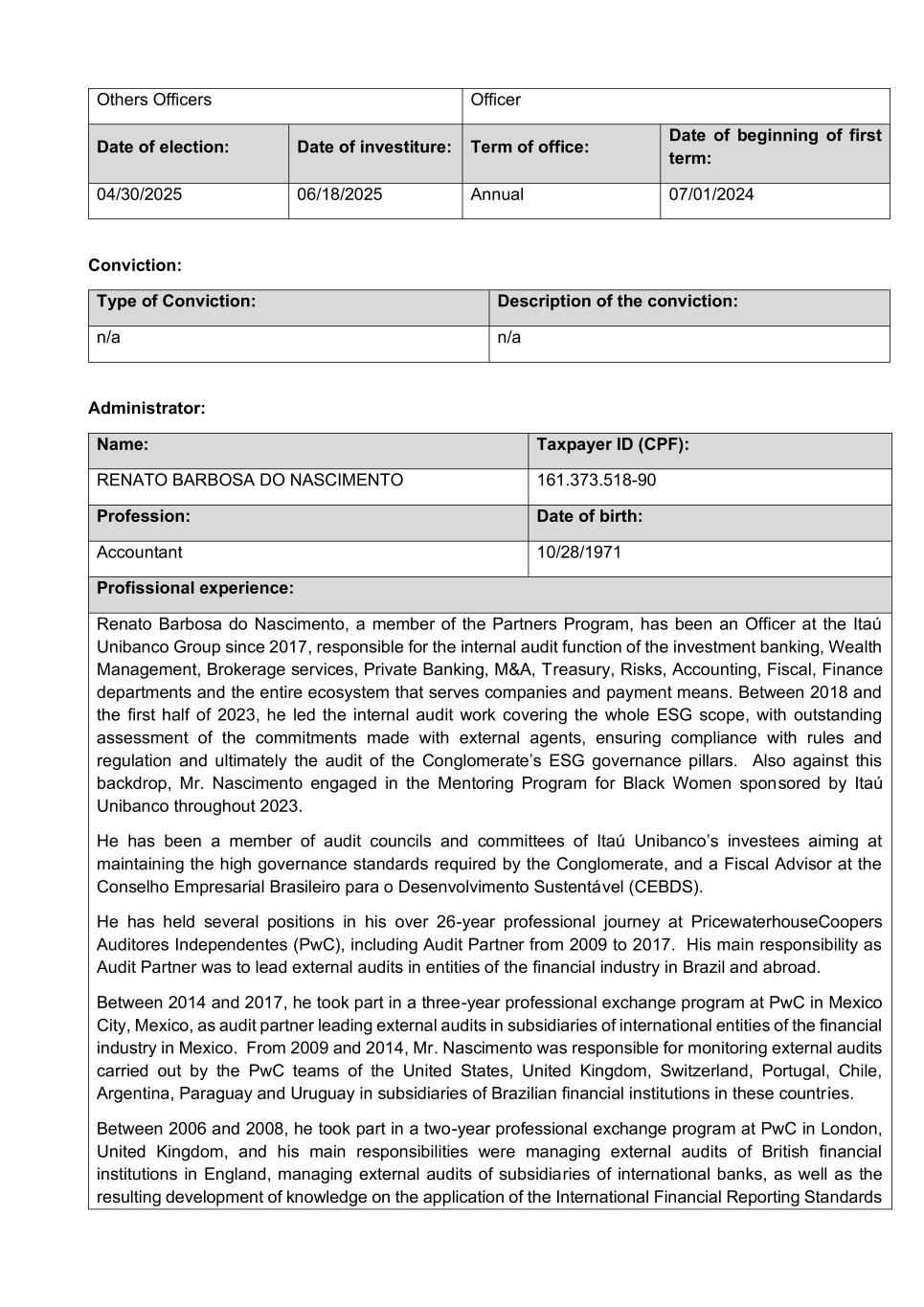Others Officers Officer Date of election: Date of investiture: Term of office: Date of beginning of first term: 04/30/2025 06/18/2025 Annual 07/01/2024 Conviction: Type of Conviction: Description of the conviction: n/a n/a Administrator: Name: Taxpayer ID (CPF): RENATO BARBOSA DO NASCIMENTO 161.373.518-90 Profession: Date of birth: Accountant 10/28/1971 Profissional experience: Renato Barbosa do Nascimento, a member of the Partners Program, has been an Officer at the Itaú Unibanco Group since 2017, responsible for the internal audit function of the investment banking, Wealth Management, Brokerage services, Private Banking, M&A, Treasury, Risks, Accounting, Fiscal, Finance departments and the entire ecosystem that serves companies and payment means. Between 2018 and the first half of 2023, he led the internal audit work covering the whole ESG scope, with outstanding assessment of the commitments made with external agents, ensuring compliance with rules and regulation and ultimately the audit of the Conglomerate’s ESG governance pillars. Also against this backdrop, Mr. Nascimento engaged in the Mentoring Program for Black Women sponsored by Itaú Unibanco throughout 2023. He has been a member of audit councils and committees of Itaú Unibanco’s investees aiming at maintaining the high governance standards required by the Conglomerate, and a Fiscal Advisor at the Conselho Empresarial Brasileiro para o Desenvolvimento Sustentável (CEBDS). He has held several positions in his over 26-year professional journey at PricewaterhouseCoopers Auditores Independentes (PwC), including Audit Partner from 2009 to 2017. His main responsibility as Audit Partner was to lead external audits in entities of the financial industry in Brazil and abroad. Between 2014 and 2017, he took part in a three-year professional exchange program at PwC in Mexico City, Mexico, as audit partner leading external audits in subsidiaries of international entities of the financial industry in Mexico. From 2009 and 2014, Mr. Nascimento was responsible for monitoring external audits carried out by the PwC teams of the United States, United Kingdom, Switzerland, Portugal, Chile, Argentina, Paraguay and Uruguay in subsidiaries of Brazilian financial institutions in these countries. Between 2006 and 2008, he took part in a two-year professional exchange program at PwC in London, United Kingdom, and his main responsibilities were managing external audits of British financial institutions in England, managing external audits of subsidiaries of international banks, as well as the resulting development of knowledge on the application of the International Financial Reporting Standards