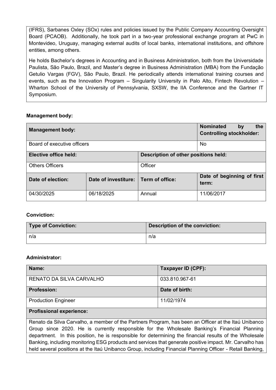 (IFRS), Sarbanes Oxley (SOx) rules and policies issued by the Public Company Accounting Oversight Board (PCAOB). Additionally, he took part in a two-year professional exchange program at PwC in Montevideo, Uruguay, managing external audits of local banks, international institutions, and offshore entities, among others. He holds Bachelor’s degrees in Accounting and in Business Administration, both from the Universidade Paulista, São Paulo, Brazil, and Master’s degree in Business Administration (MBA) from the Fundação Getulio Vargas (FGV), São Paulo, Brazil. He periodically attends international training courses and events, such as the Innovation Program – Singularity University in Palo Alto, Fintech Revolution – Wharton School of the University of Pennsylvania, SXSW, the IIA Conference and the Gartner IT Symposium. Management body: Management body: Nominated by the Controlling stockholder: Board of executive officers No Elective office held: Description of other positions held: Others Officers Officer Date of election: Date of investiture: Term of office: Date of beginning of first term: 04/30/2025 06/18/2025 Annual 11/06/2017 Conviction: Type of Conviction: Description of the conviction: n/a n/a Administrator: Name: Taxpayer ID (CPF): RENATO DA SILVA CARVALHO 033.810.967-61 Profession: Date of birth: Production Engineer 11/02/1974 Profissional experience: Renato da Silva Carvalho, a member of the Partners Program, has been an Officer at the Itaú Unibanco Group since 2020. He is currently responsible for the Wholesale Banking’s Financial Planning department. In this position, he is responsible for determining the financial results of the Wholesale Banking, including monitoring ESG products and services that generate positive impact. Mr. Carvalho has held several positions at the Itaú Unibanco Group, including Financial Planning Officer - Retail Banking,