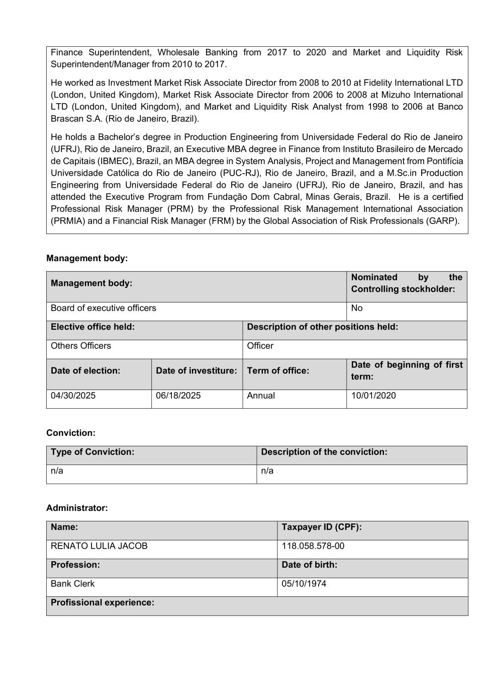 Finance Superintendent, Wholesale Banking from 2017 to 2020 and Market and Liquidity Risk Superintendent/Manager from 2010 to 2017. He worked as Investment Market Risk Associate Director from 2008 to 2010 at Fidelity International LTD (London, United Kingdom), Market Risk Associate Director from 2006 to 2008 at Mizuho International LTD (London, United Kingdom), and Market and Liquidity Risk Analyst from 1998 to 2006 at Banco Brascan S.A. (Rio de Janeiro, Brazil). He holds a Bachelor’s degree in Production Engineering from Universidade Federal do Rio de Janeiro (UFRJ), Rio de Janeiro, Brazil, an Executive MBA degree in Finance from Instituto Brasileiro de Mercado de Capitais (IBMEC), Brazil, an MBA degree in System Analysis, Project and Management from Pontifícia Universidade Católica do Rio de Janeiro (PUC-RJ), Rio de Janeiro, Brazil, and a M.Sc.in Production Engineering from Universidade Federal do Rio de Janeiro (UFRJ), Rio de Janeiro, Brazil, and has attended the Executive Program from Fundação Dom Cabral, Minas Gerais, Brazil. He is a certified Professional Risk Manager (PRM) by the Professional Risk Management International Association (PRMIA) and a Financial Risk Manager (FRM) by the Global Association of Risk Professionals (GARP). Management body: Management body: Nominated by the Controlling stockholder: Board of executive officers No Elective office held: Description of other positions held: Others Officers Officer Date of election: Date of investiture: Term of office: Date of beginning of first term: 04/30/2025 06/18/2025 Annual 10/01/2020 Conviction: Type of Conviction: Description of the conviction: n/a n/a Administrator: Name: Taxpayer ID (CPF): RENATO LULIA JACOB 118.058.578-00 Profession: Date of birth: Bank Clerk 05/10/1974 Profissional experience: