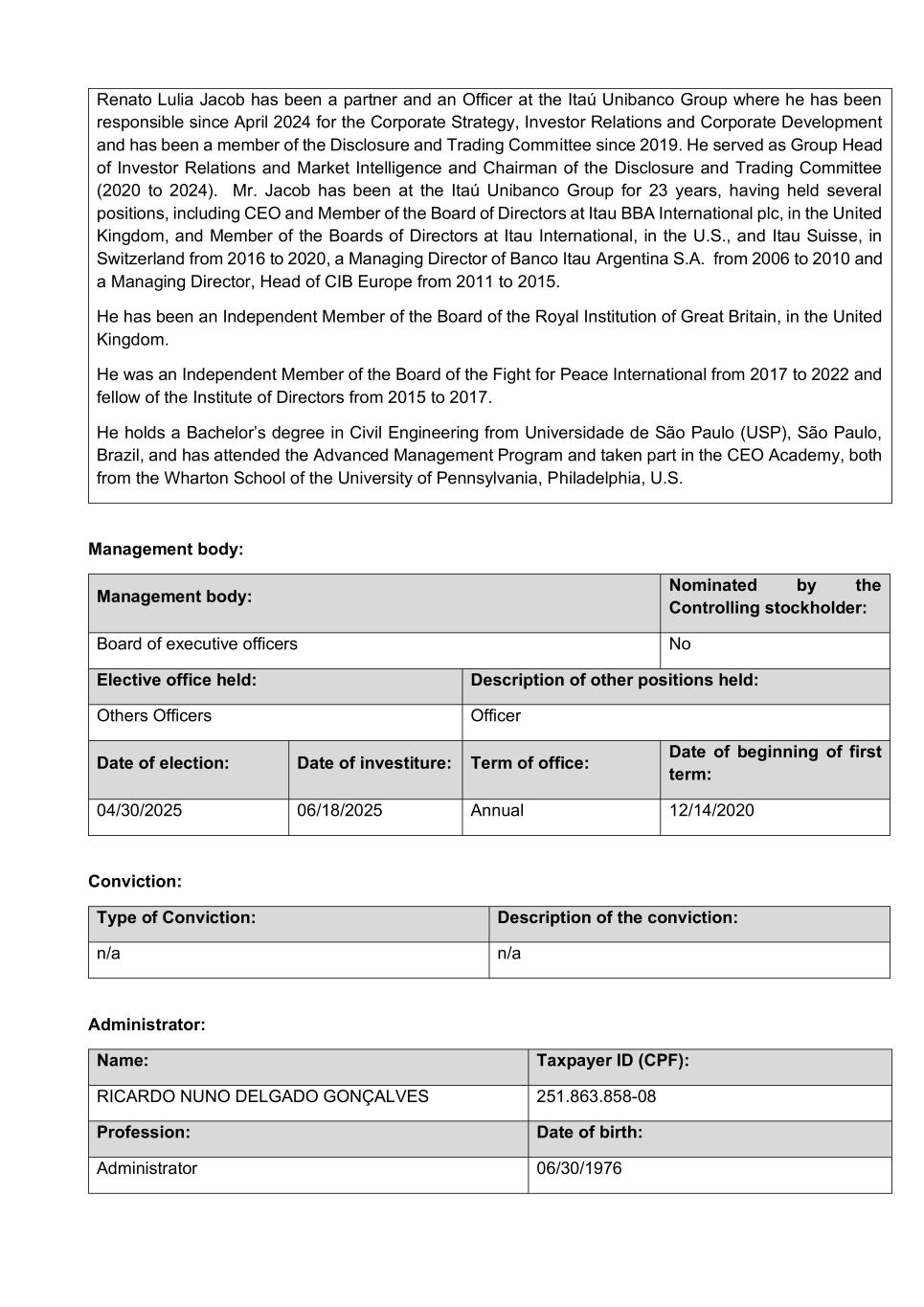 Renato Lulia Jacob has been a partner and an Officer at the Itaú Unibanco Group where he has been responsible since April 2024 for the Corporate Strategy, Investor Relations and Corporate Development and has been a member of the Disclosure and Trading Committee since 2019. He served as Group Head of Investor Relations and Market Intelligence and Chairman of the Disclosure and Trading Committee (2020 to 2024). Mr. Jacob has been at the Itaú Unibanco Group for 23 years, having held several positions, including CEO and Member of the Board of Directors at Itau BBA International plc, in the United Kingdom, and Member of the Boards of Directors at Itau International, in the U.S., and Itau Suisse, in Switzerland from 2016 to 2020, a Managing Director of Banco Itau Argentina S.A. from 2006 to 2010 and a Managing Director, Head of CIB Europe from 2011 to 2015. He has been an Independent Member of the Board of the Royal Institution of Great Britain, in the United Kingdom. He was an Independent Member of the Board of the Fight for Peace International from 2017 to 2022 and fellow of the Institute of Directors from 2015 to 2017. He holds a Bachelor’s degree in Civil Engineering from Universidade de São Paulo (USP), São Paulo, Brazil, and has attended the Advanced Management Program and taken part in the CEO Academy, both from the Wharton School of the University of Pennsylvania, Philadelphia, U.S. Management body: Management body: Nominated by the Controlling stockholder: Board of executive officers No Elective office held: Description of other positions held: Others Officers Officer Date of election: Date of investiture: Term of office: Date of beginning of first term: 04/30/2025 06/18/2025 Annual 12/14/2020 Conviction: Type of Conviction: Description of the conviction: n/a n/a Administrator: Name: Taxpayer ID (CPF): RICARDO NUNO DELGADO GONÇALVES 251.863.858-08 Profession: Date of birth: Administrator 06/30/1976