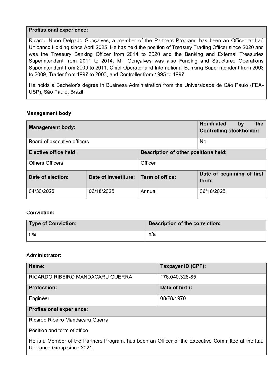 Profissional experience: Ricardo Nuno Delgado Gonçalves, a member of the Partners Program, has been an Officer at Itaú Unibanco Holding since April 2025. He has held the position of Treasury Trading Officer since 2020 and was the Treasury Banking Officer from 2014 to 2020 and the Banking and External Treasuries Superintendent from 2011 to 2014. Mr. Gonçalves was also Funding and Structured Operations Superintendent from 2009 to 2011, Chief Operator and International Banking Superintendent from 2003 to 2009, Trader from 1997 to 2003, and Controller from 1995 to 1997. He holds a Bachelor’s degree in Business Administration from the Universidade de São Paulo (FEA- USP), São Paulo, Brazil. Management body: Management body: Nominated by the Controlling stockholder: Board of executive officers No Elective office held: Description of other positions held: Others Officers Officer Date of election: Date of investiture: Term of office: Date of beginning of first term: 04/30/2025 06/18/2025 Annual 06/18/2025 Conviction: Type of Conviction: Description of the conviction: n/a n/a Administrator: Name: Taxpayer ID (CPF): RICARDO RIBEIRO MANDACARU GUERRA 176.040.328-85 Profession: Date of birth: Engineer 08/28/1970 Profissional experience: Ricardo Ribeiro Mandacaru Guerra Position and term of office He is a Member of the Partners Program, has been an Officer of the Executive Committee at the Itaú Unibanco Group since 2021.