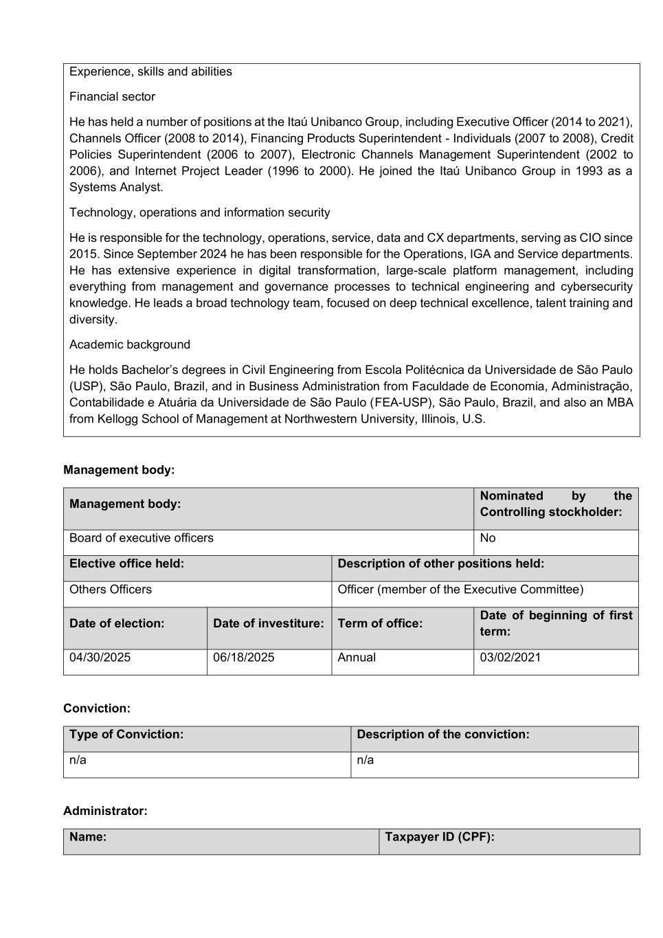 Experience, skills and abilities Financial sector He has held a number of positions at the Itaú Unibanco Group, including Executive Officer (2014 to 2021), Channels Officer (2008 to 2014), Financing Products Superintendent - Individuals (2007 to 2008), Credit Policies Superintendent (2006 to 2007), Electronic Channels Management Superintendent (2002 to 2006), and Internet Project Leader (1996 to 2000). He joined the Itaú Unibanco Group in 1993 as a Systems Analyst. Technology, operations and information security He is responsible for the technology, operations, service, data and CX departments, serving as CIO since 2015. Since September 2024 he has been responsible for the Operations, IGA and Service departments. He has extensive experience in digital transformation, large-scale platform management, including everything from management and governance processes to technical engineering and cybersecurity knowledge. He leads a broad technology team, focused on deep technical excellence, talent training and diversity. Academic background He holds Bachelor’s degrees in Civil Engineering from Escola Politécnica da Universidade de São Paulo (USP), São Paulo, Brazil, and in Business Administration from Faculdade de Economia, Administração, Contabilidade e Atuária da Universidade de São Paulo (FEA-USP), São Paulo, Brazil, and also an MBA from Kellogg School of Management at Northwestern University, Illinois, U.S. Management body: Management body: Nominated by the Controlling stockholder: Board of executive officers No Elective office held: Description of other positions held: Others Officers Officer (member of the Executive Committee) Date of election: Date of investiture: Term of office: Date of beginning of first term: 04/30/2025 06/18/2025 Annual 03/02/2021 Conviction: Type of Conviction: Description of the conviction: n/a n/a Administrator: Name: Taxpayer ID (CPF):