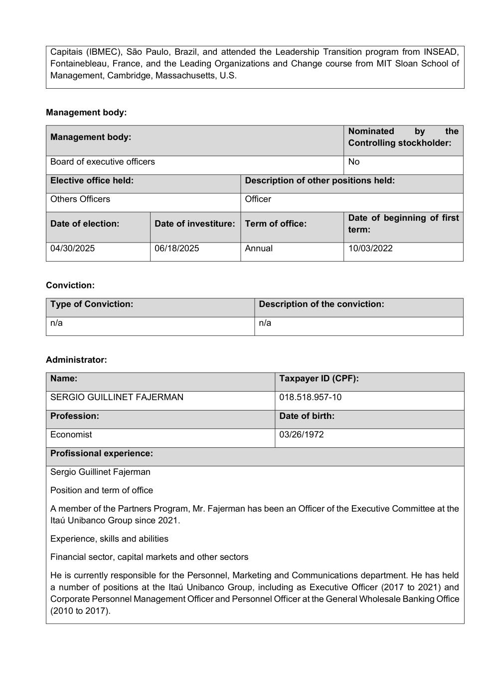 Capitais (IBMEC), São Paulo, Brazil, and attended the Leadership Transition program from INSEAD, Fontainebleau, France, and the Leading Organizations and Change course from MIT Sloan School of Management, Cambridge, Massachusetts, U.S. Management body: Management body: Nominated by the Controlling stockholder: Board of executive officers No Elective office held: Description of other positions held: Others Officers Officer Date of election: Date of investiture: Term of office: Date of beginning of first term: 04/30/2025 06/18/2025 Annual 10/03/2022 Conviction: Type of Conviction: Description of the conviction: n/a n/a Administrator: Name: Taxpayer ID (CPF): SERGIO GUILLINET FAJERMAN 018.518.957-10 Profession: Date of birth: Economist 03/26/1972 Profissional experience: Sergio Guillinet Fajerman Position and term of office A member of the Partners Program, Mr. Fajerman has been an Officer of the Executive Committee at the Itaú Unibanco Group since 2021. Experience, skills and abilities Financial sector, capital markets and other sectors He is currently responsible for the Personnel, Marketing and Communications department. He has held a number of positions at the Itaú Unibanco Group, including as Executive Officer (2017 to 2021) and Corporate Personnel Management Officer and Personnel Officer at the General Wholesale Banking Office (2010 to 2017).