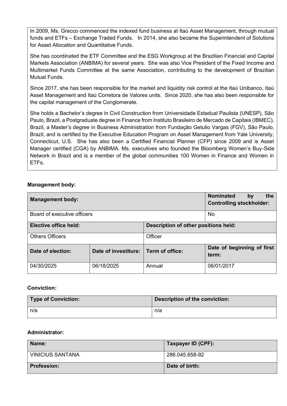 In 2009, Ms. Grecco commenced the indexed fund business at Itaú Asset Management, through mutual funds and ETFs – Exchange Traded Funds. In 2014, she also became the Superintendent of Solutions for Asset Allocation and Quantitative Funds. She has coordinated the ETF Committee and the ESG Workgroup at the Brazilian Financial and Capital Markets Association (ANBIMA) for several years. She was also Vice President of the Fixed Income and Multimarket Funds Committee at the same Association, contributing to the development of Brazilian Mutual Funds. Since 2017, she has been responsible for the market and liquidity risk control at the Itaú Unibanco, Itaú Asset Management and Itaú Corretora de Valores units. Since 2020, she has also been responsible for the capital management of the Conglomerate. She holds a Bachelor’s degree in Civil Construction from Universidade Estadual Paulista (UNESP), São Paulo, Brazil, a Postgraduate degree in Finance from Instituto Brasileiro de Mercado de Capitais (IBMEC), Brazil, a Master’s degree in Business Administration from Fundação Getulio Vargas (FGV), São Paulo, Brazil, and is certified by the Executive Education Program on Asset Management from Yale University, Connecticut, U.S. She has also been a Certified Financial Planner (CFP) since 2009 and is Asset Manager certified (CGA) by ANBIMA. Ms. executives who founded the Bloomberg Women’s Buy-Side Network in Brazil and is a member of the global communities 100 Women in Finance and Women in ETFs. Management body: Management body: Nominated by the Controlling stockholder: Board of executive officers No Elective office held: Description of other positions held: Others Officers Officer Date of election: Date of investiture: Term of office: Date of beginning of first term: 04/30/2025 06/18/2025 Annual 06/01/2017 Conviction: Type of Conviction: Description of the conviction: n/a n/a Administrator: Name: Taxpayer ID (CPF): VINICIUS SANTANA 286.045.658-92 Profession: Date of birth: