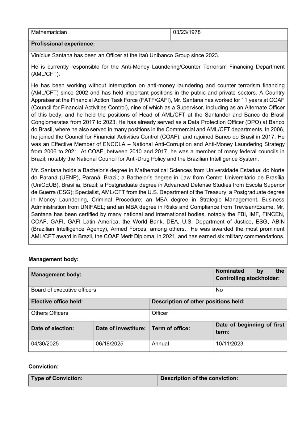 Mathematician 03/23/1978 Profissional experience: Vinícius Santana has been an Officer at the Itaú Unibanco Group since 2023. He is currently responsible for the Anti-Money Laundering/Counter Terrorism Financing Department (AML/CFT). He has been working without interruption on anti-money laundering and counter terrorism financing (AML/CFT) since 2002 and has held important positions in the public and private sectors. A Country Appraiser at the Financial Action Task Force (FATF/GAFI), Mr. Santana has worked for 11 years at COAF (Council for Financial Activities Control), nine of which as a Supervisor, including as an Alternate Officer of this body, and he held the positions of Head of AML/CFT at the Santander and Banco do Brasil Conglomerates from 2017 to 2023. He has already served as a Data Protection Officer (DPO) at Banco do Brasil, where he also served in many positions in the Commercial and AML/CFT departments. In 2006, he joined the Council for Financial Activities Control (COAF), and rejoined Banco do Brasil in 2017. He was an Effective Member of ENCCLA – National Anti-Corruption and Anti-Money Laundering Strategy from 2006 to 2021. At COAF, between 2010 and 2017, he was a member of many federal councils in Brazil, notably the National Council for Anti-Drug Policy and the Brazilian Intelligence System. Mr. Santana holds a Bachelor’s degree in Mathematical Sciences from Universidade Estadual do Norte do Paraná (UENP), Paraná, Brazil; a Bachelor’s degree in Law from Centro Universitário de Brasília (UniCEUB), Brasília, Brazil; a Postgraduate degree in Advanced Defense Studies from Escola Superior de Guerra (ESG); Specialist, AML/CFT from the U.S. Department of the Treasury; a Postgraduate degree in Money Laundering, Criminal Procedure; an MBA degree in Strategic Management, Business Administration from UNIFAEL; and an MBA degree in Risks and Compliance from Trevisan/Exame. Mr. Santana has been certified by many national and international bodies, notably the FBI, IMF, FINCEN, COAF, GAFI, GAFI Latin America, the World Bank, DEA, U.S. Department of Justice, ESG, ABIN (Brazilian Intelligence Agency), Armed Forces, among others. He was awarded the most prominent AML/CFT award in Brazil, the COAF Merit Diploma, in 2021, and has earned six military commendations. Management body: Management body: Nominated by the Controlling stockholder: Board of executive officers No Elective office held: Description of other positions held: Others Officers Officer Date of election: Date of investiture: Term of office: Date of beginning of first term: 04/30/2025 06/18/2025 Annual 10/11/2023 Conviction: Type of Conviction: Description of the conviction: