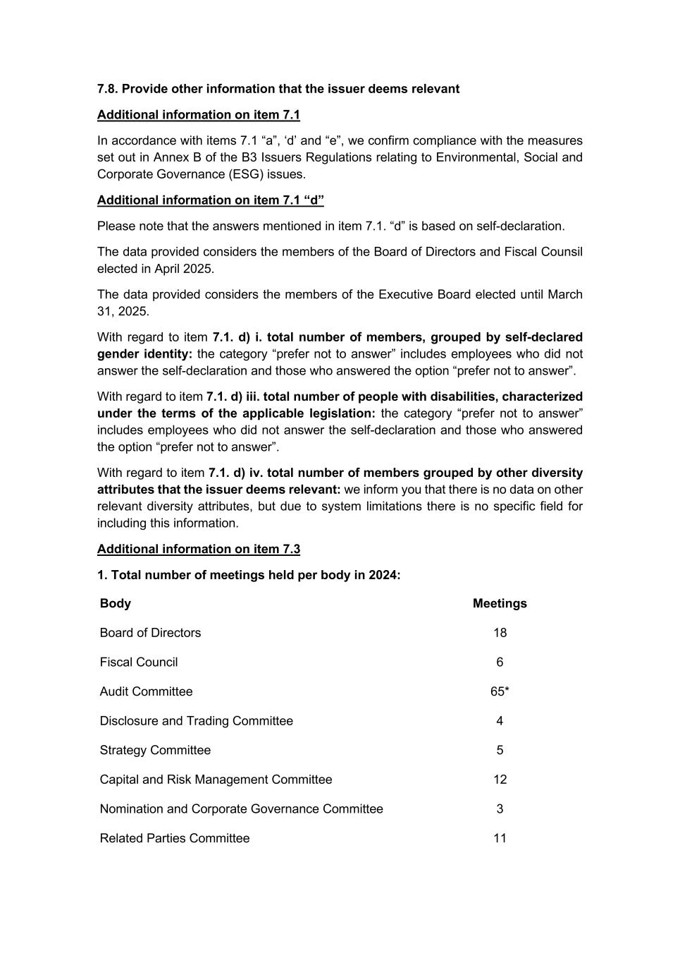 7.8. Provide other information that the issuer deems relevant Additional information on item 7.1 In accordance with items 7.1 “a”, ‘d’ and “e”, we confirm compliance with the measures set out in Annex B of the B3 Issuers Regulations relating to Environmental, Social and Corporate Governance (ESG) issues. Additional information on item 7.1 “d” Please note that the answers mentioned in item 7.1. “d” is based on self-declaration. The data provided considers the members of the Board of Directors and Fiscal Counsil elected in April 2025. The data provided considers the members of the Executive Board elected until March 31, 2025. With regard to item 7.1. d) i. total number of members, grouped by self-declared gender identity: the category “prefer not to answer” includes employees who did not answer the self-declaration and those who answered the option “prefer not to answer”. With regard to item 7.1. d) iii. total number of people with disabilities, characterized under the terms of the applicable legislation: the category “prefer not to answer” includes employees who did not answer the self-declaration and those who answered the option “prefer not to answer”. With regard to item 7.1. d) iv. total number of members grouped by other diversity attributes that the issuer deems relevant: we inform you that there is no data on other relevant diversity attributes, but due to system limitations there is no specific field for including this information. Additional information on item 7.3 1. Total number of meetings held per body in 2024: Body Meetings Board of Directors 18 Fiscal Council 6 Audit Committee 65* Disclosure and Trading Committee 4 Strategy Committee 5 Capital and Risk Management Committee 12 Nomination and Corporate Governance Committee 3 Related Parties Committee 11